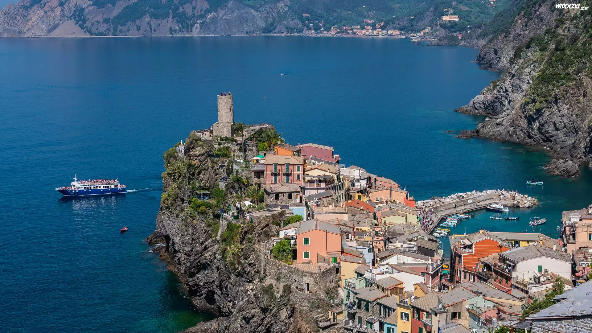 Zdjęcia, Morze, Skały, Domy, Statek, Vernazza, Włochy