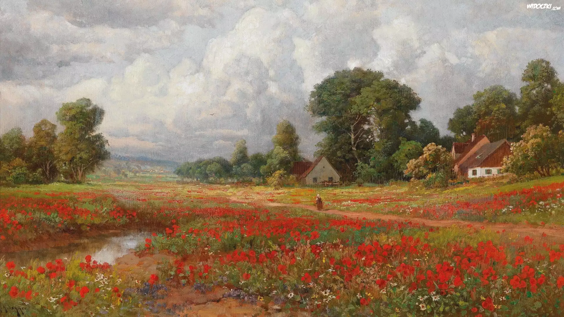 Zdjęcia, Malarstwo, Alois Arnegger, Wieś, Domy, Łąka, Maki, Drzewa, Staw