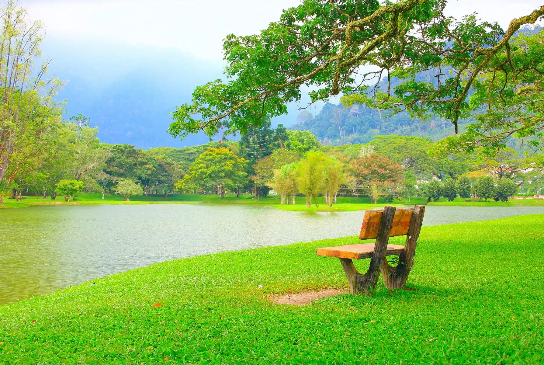Zdjęcia, Staw, Drzewa, Ławka, Trawa