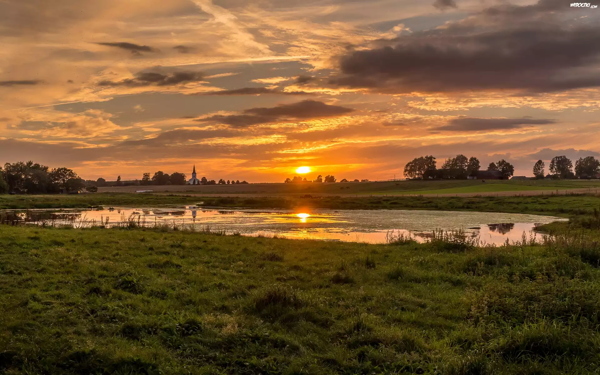 Zdjęcia, Staw, Zachód słońca, Drzewa, Domy