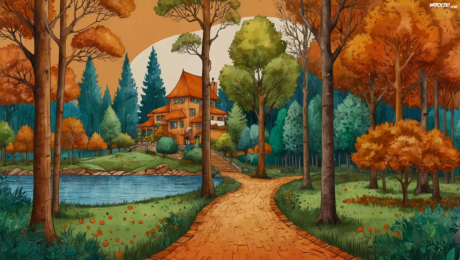 Jesień, Droga, Drzewa, Staw, Dom, Grafika
