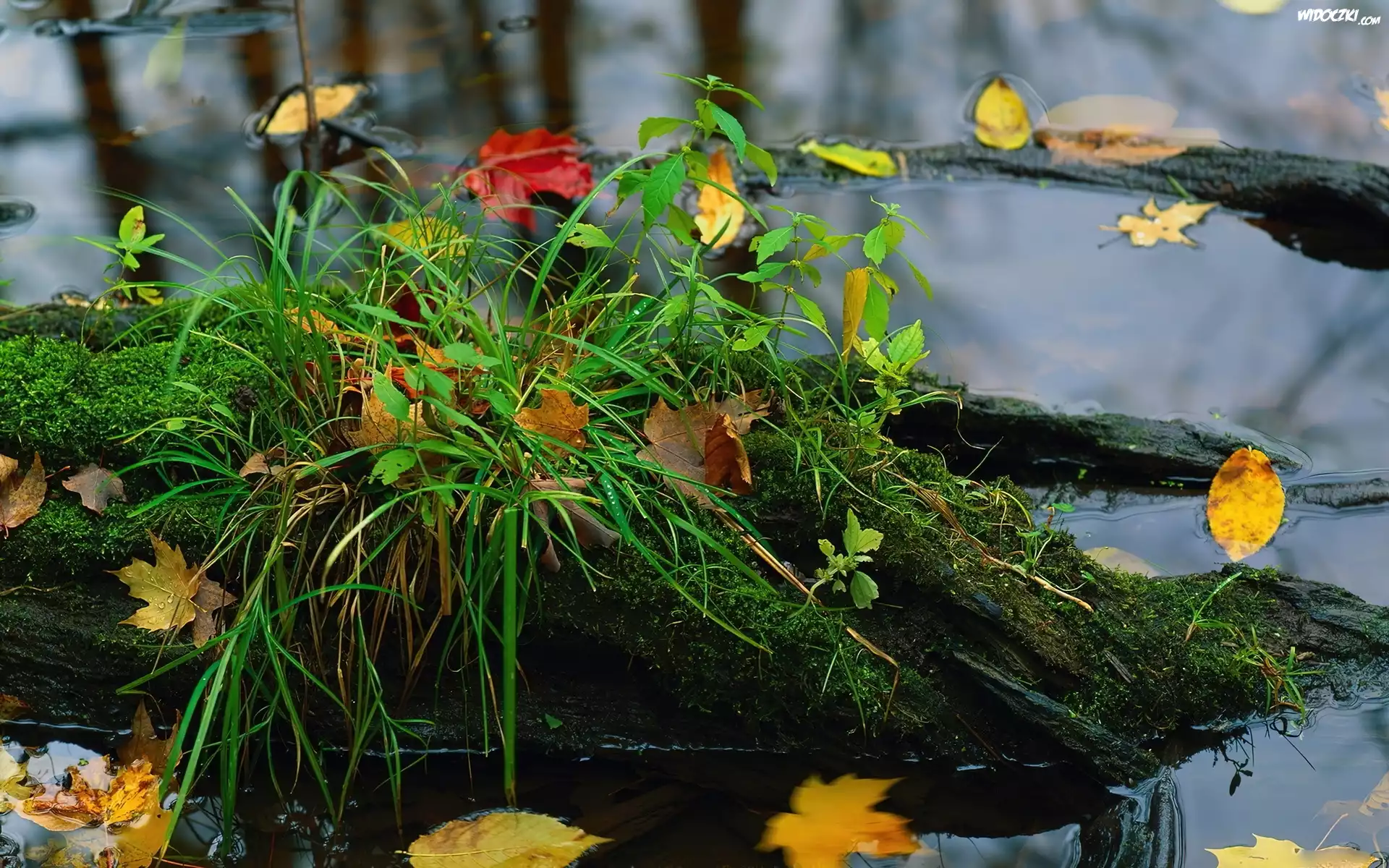 Zdjęcia, Staw, Jesienne, Liście, Kępa, Trawy