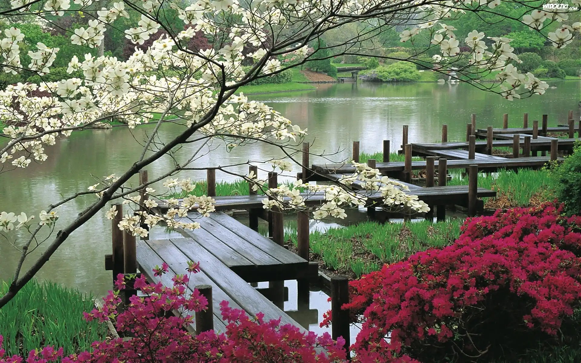 Zdjęcia, Staw, Kwitnące, Krzewy, Ławeczki