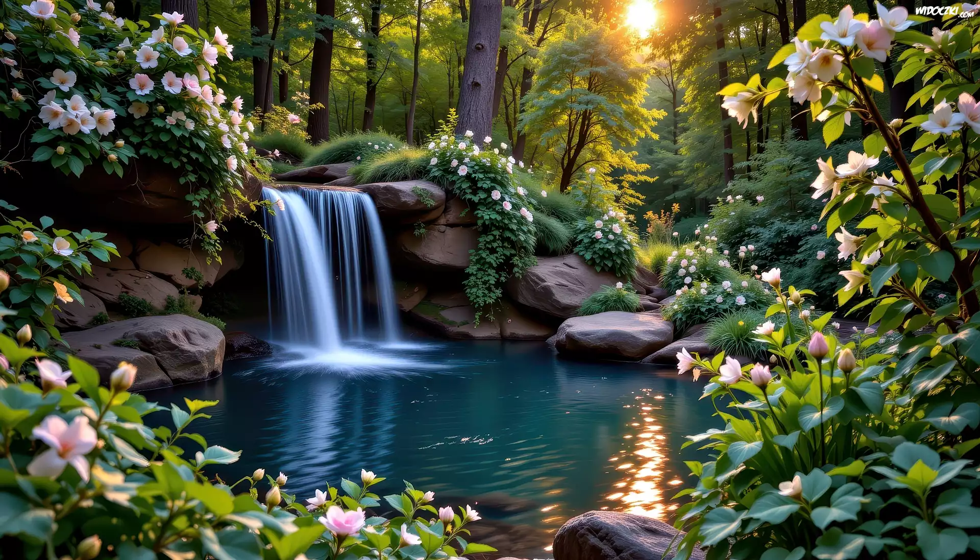 Wodospad, Las, Kwiaty, Zachód słońca, Grafika AI, Staw