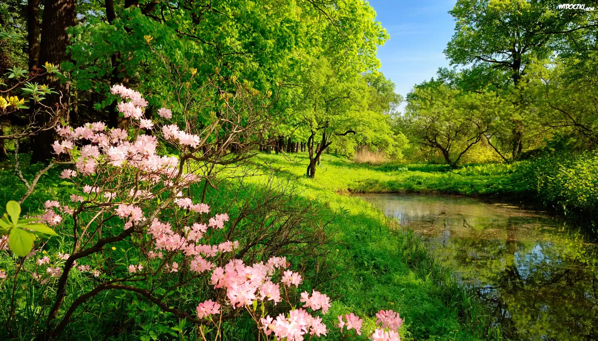 Zdjęcia, Łąka, Kwitnący, Krzew, Staw, Drzewa