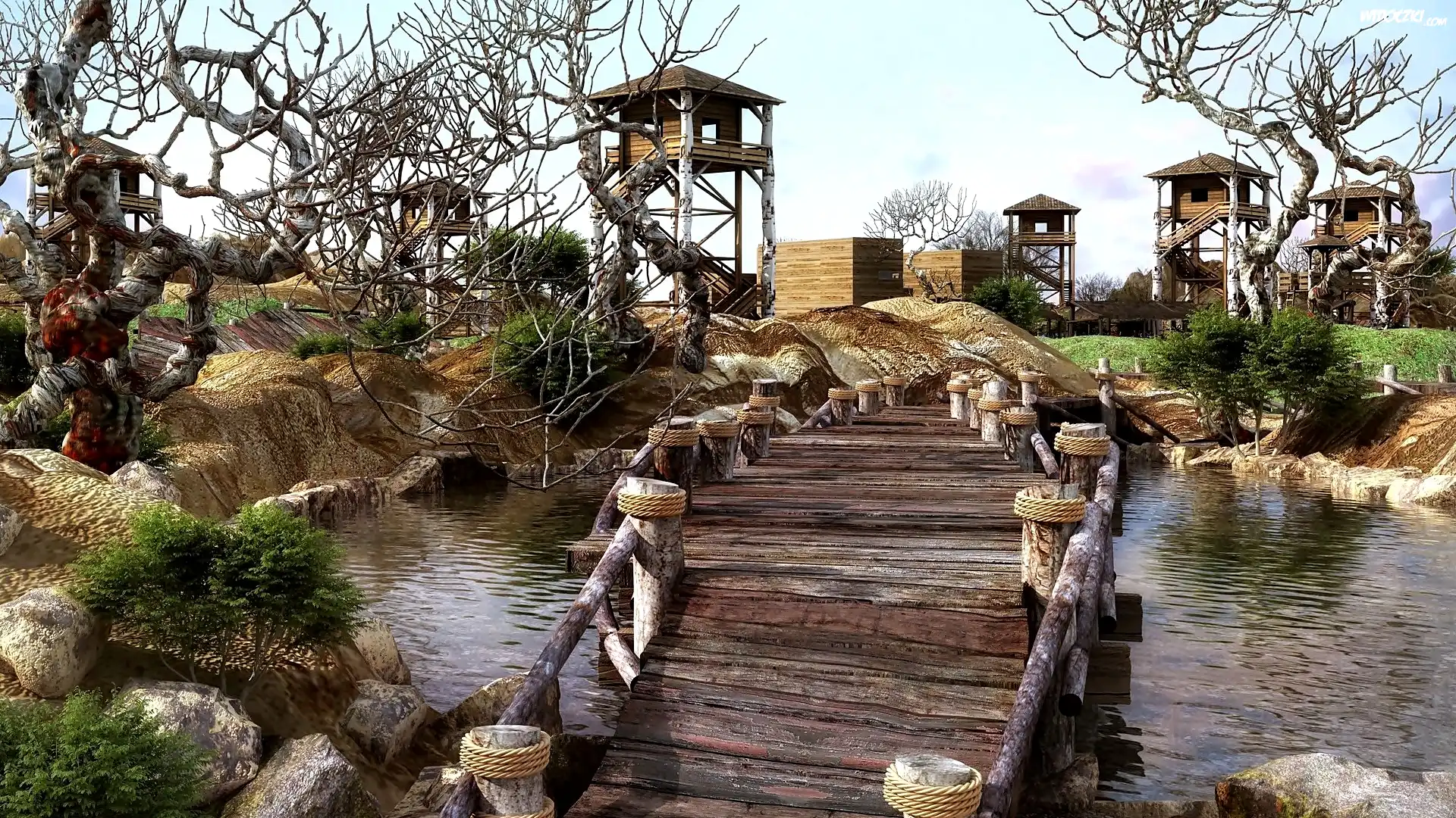 Zdjęcia, Mostek, Staw, Drzewa, Roślinność, Kamienie, Wieżyczki, Drewniane