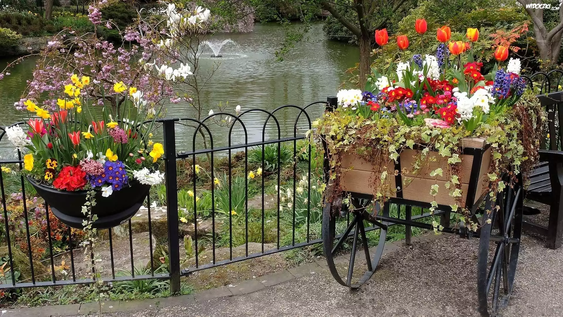 Staw, Fontanna, Dekoracje, Kwiatowe, Park, Anglia