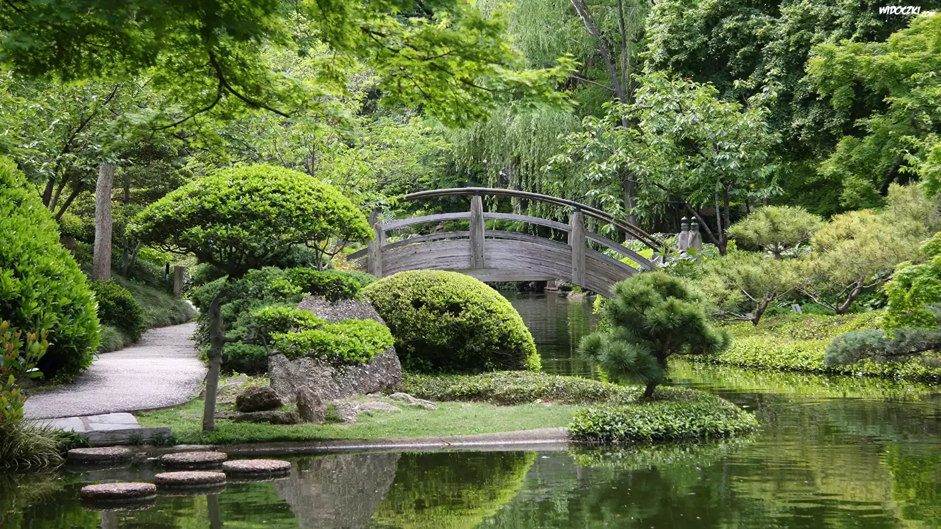 Park, Staw, Drewniany, Mostek, Krzewy, Drzewa, Roślinność