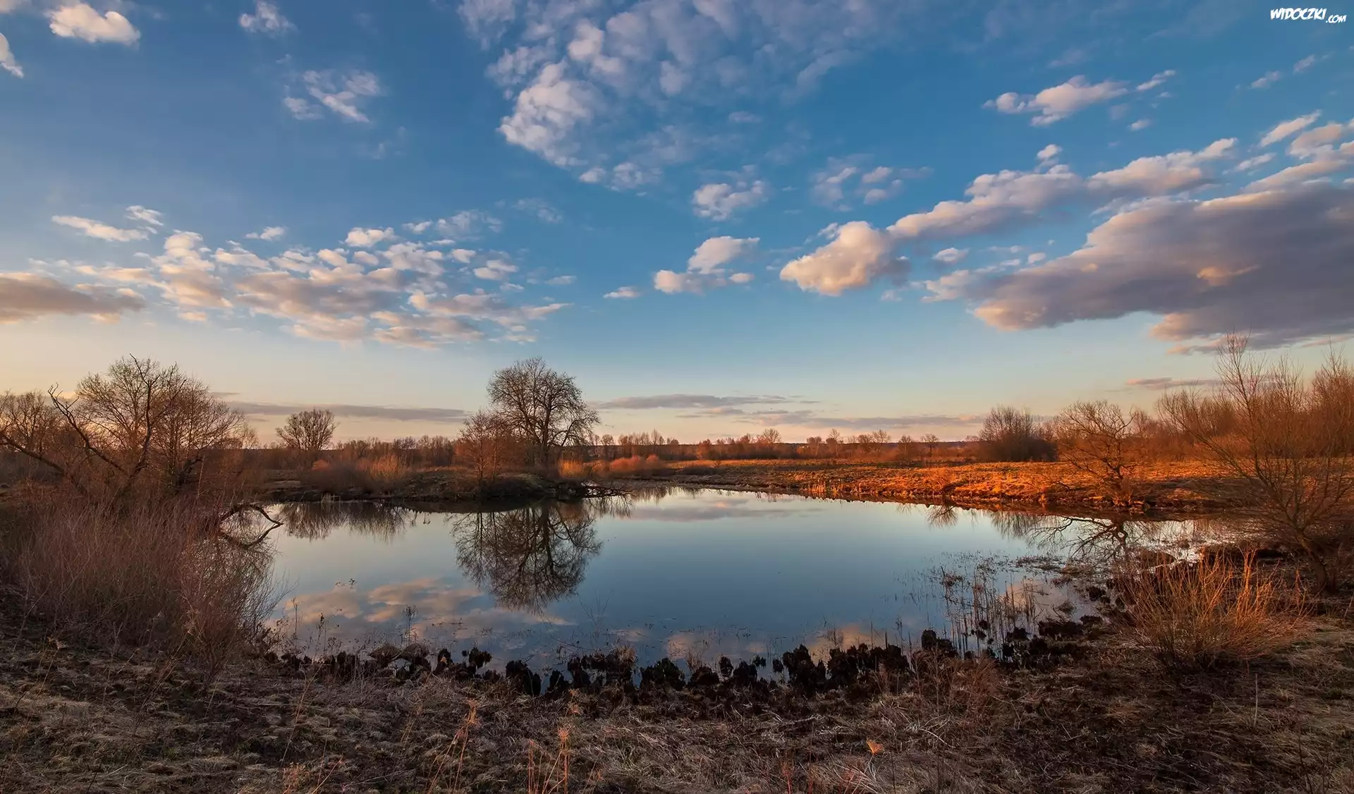 Zdj臋cia, Staw, Drzewa, Szuwary, Chmury