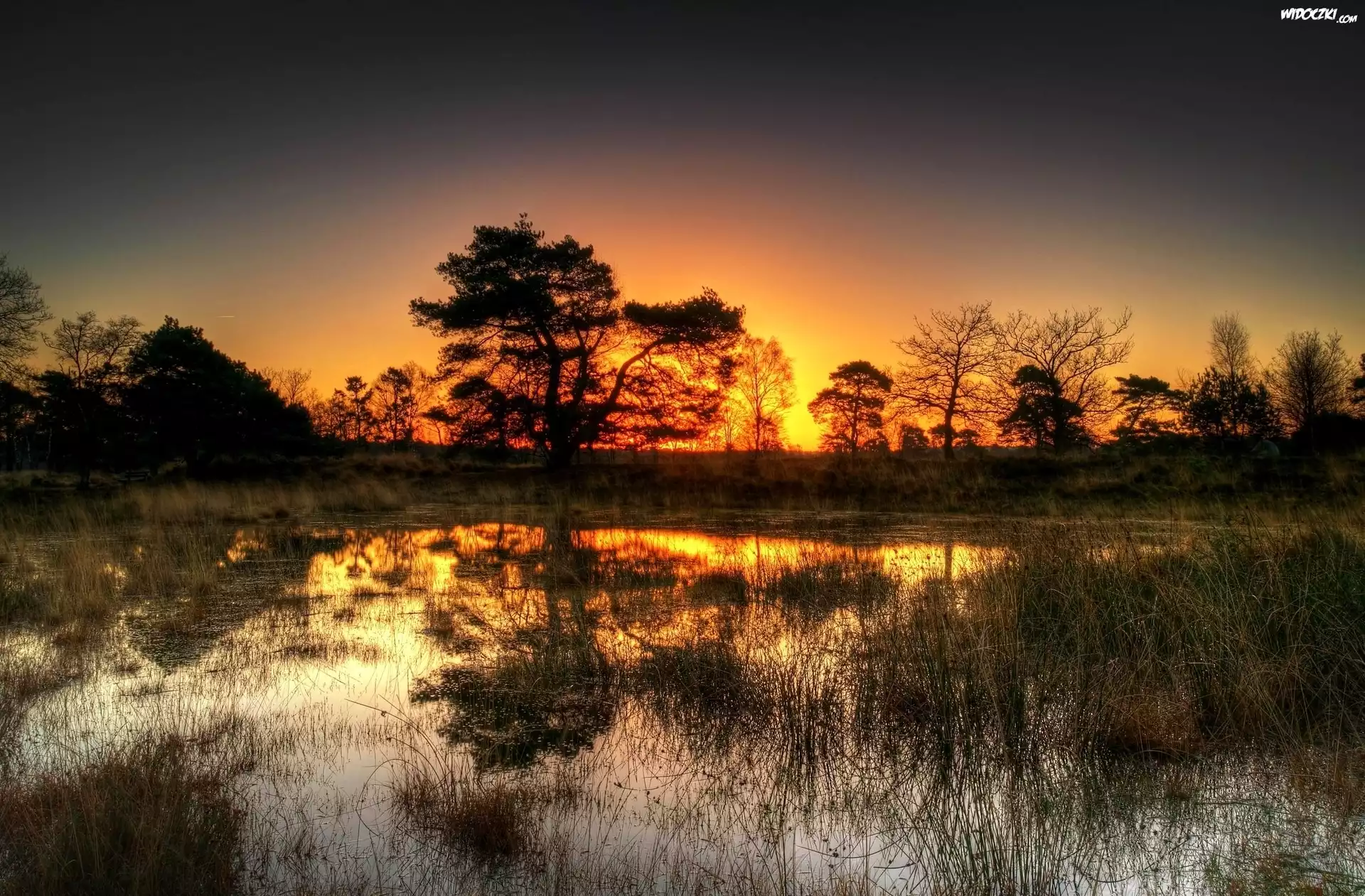 Zdjęcia, Staw, Drzewa, Trawy, Zachód, Słońca