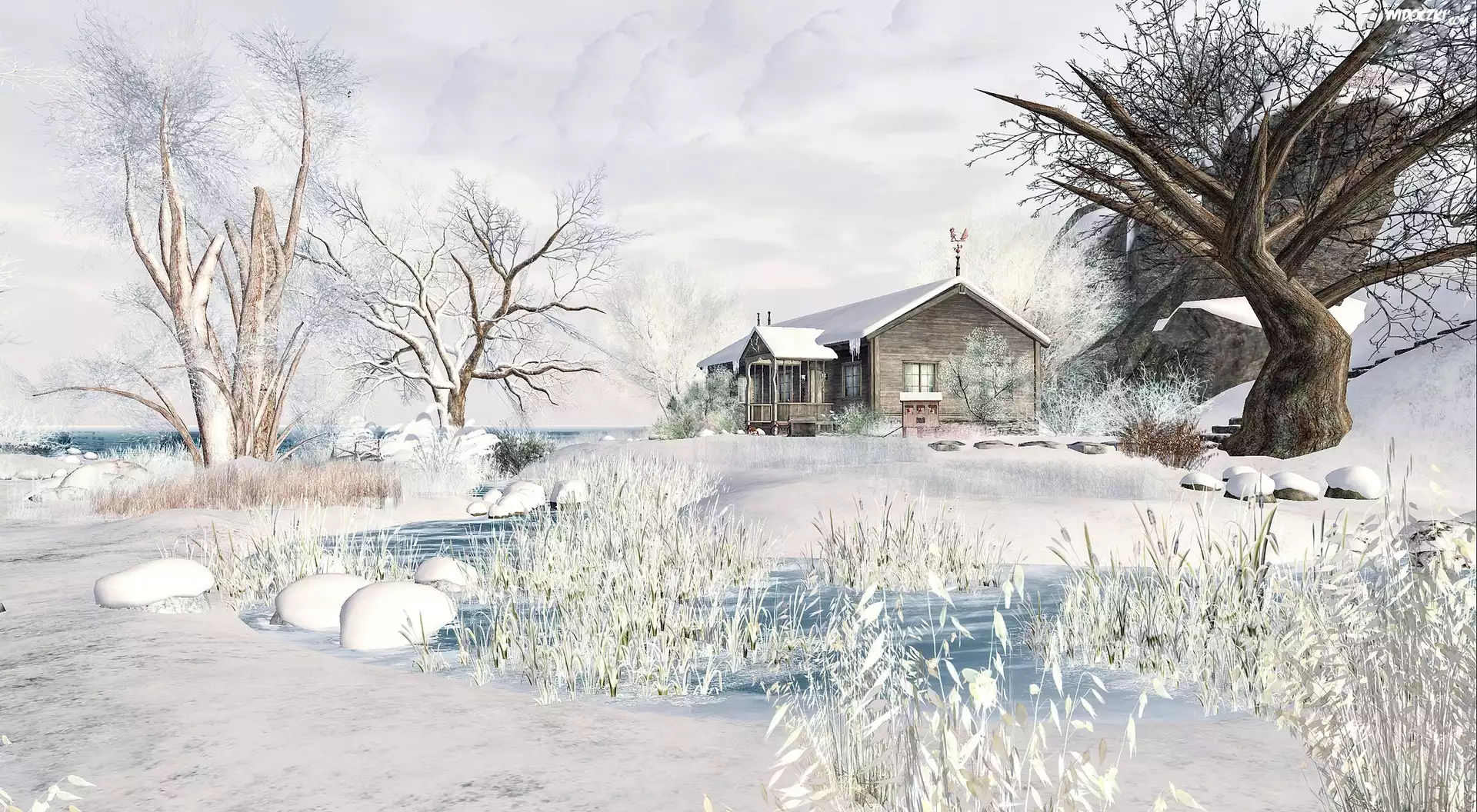 Zima, Staw, Dom, Skały, Drzewo, Grafika komputerowa
