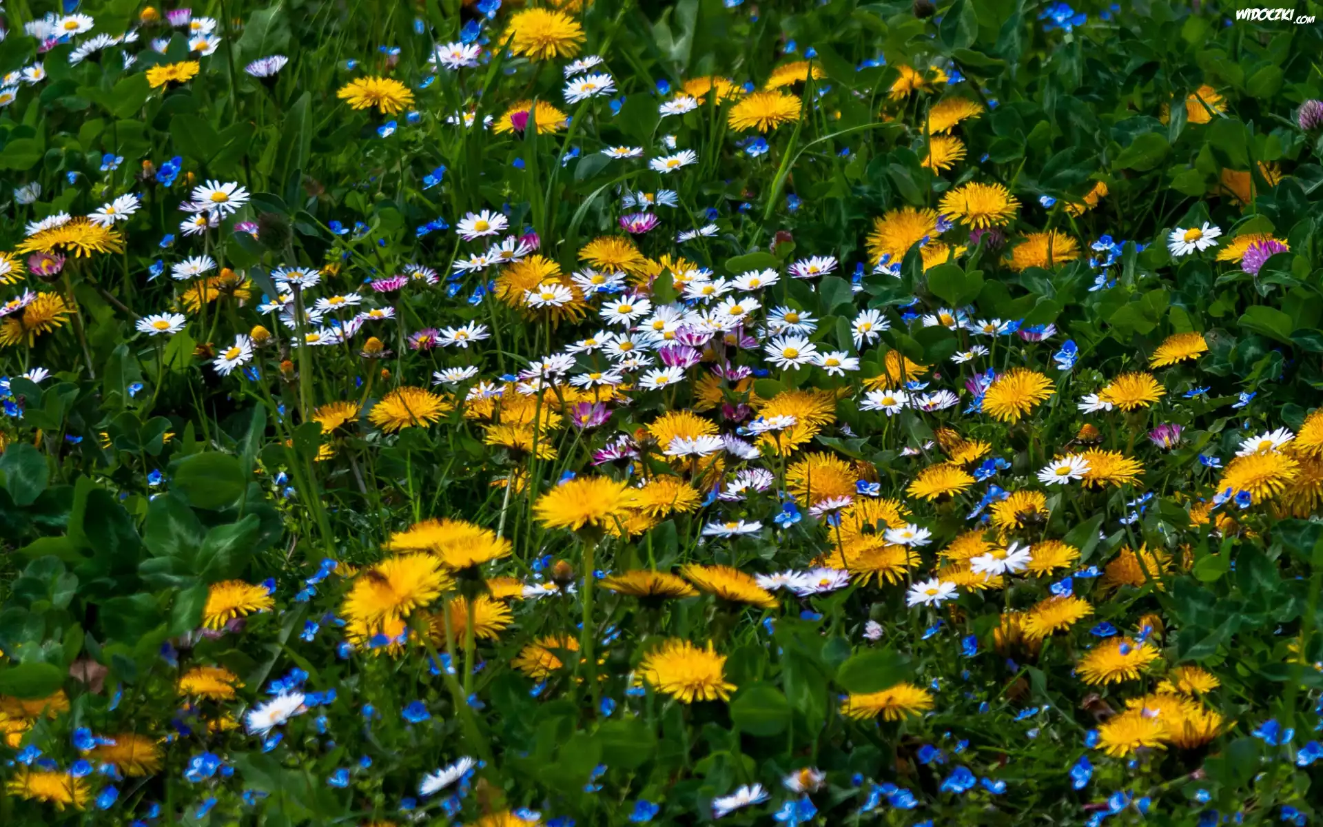 Zdjęcia, Łąka, Mniszek lekarski, Stokrotki, Trawa
