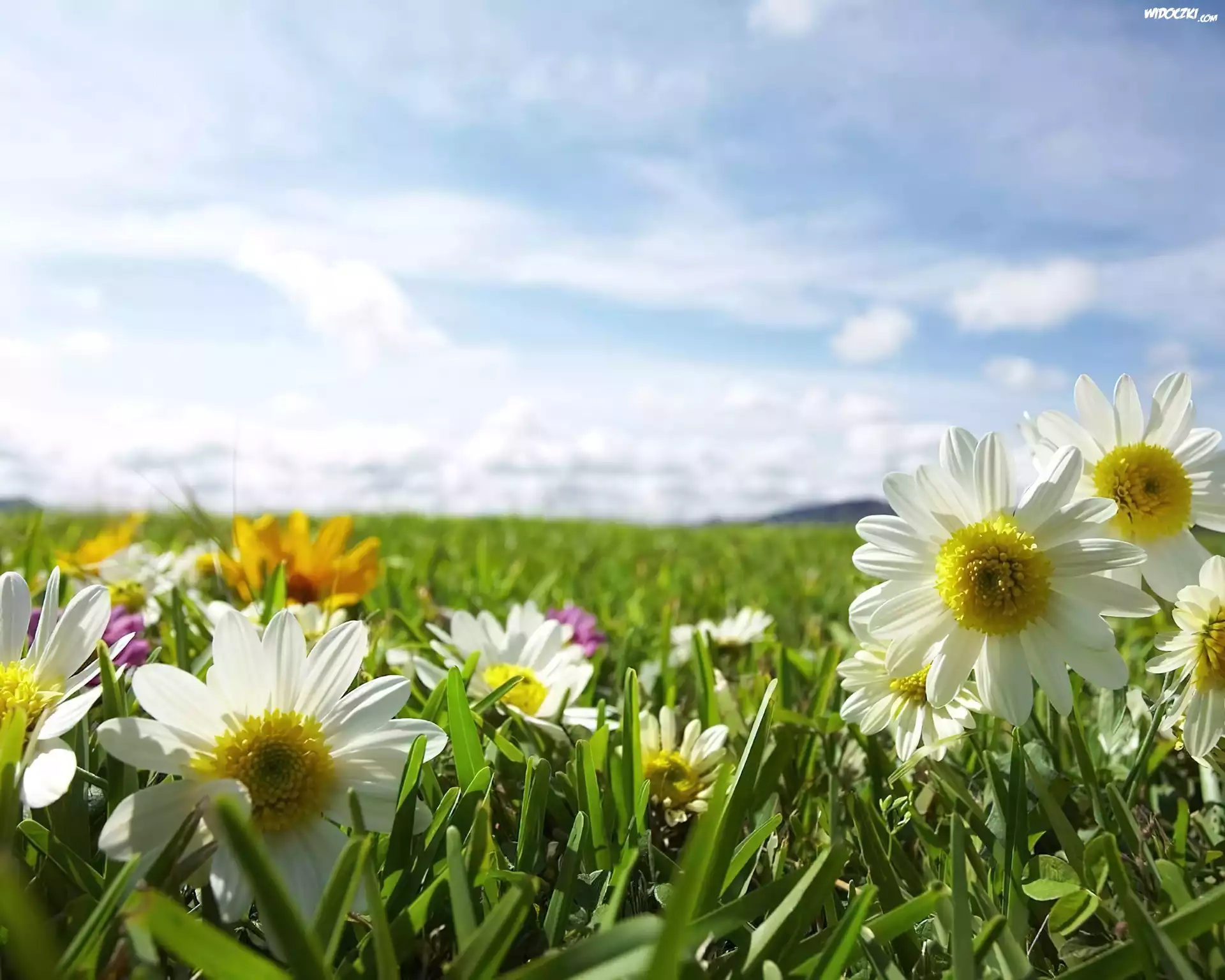 Zdjęcia, Łąka, Trawa, Stokrotki, Niebo