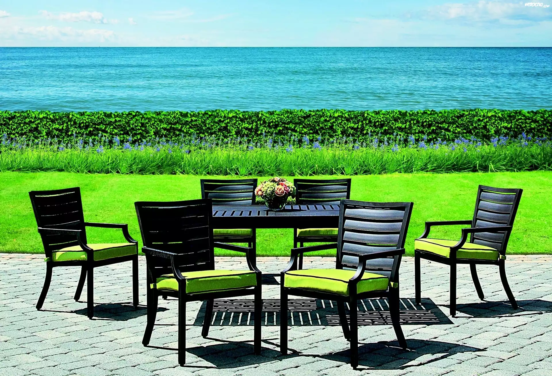 Zdjęcia, Stół, Krzesła, Morze, Trawa