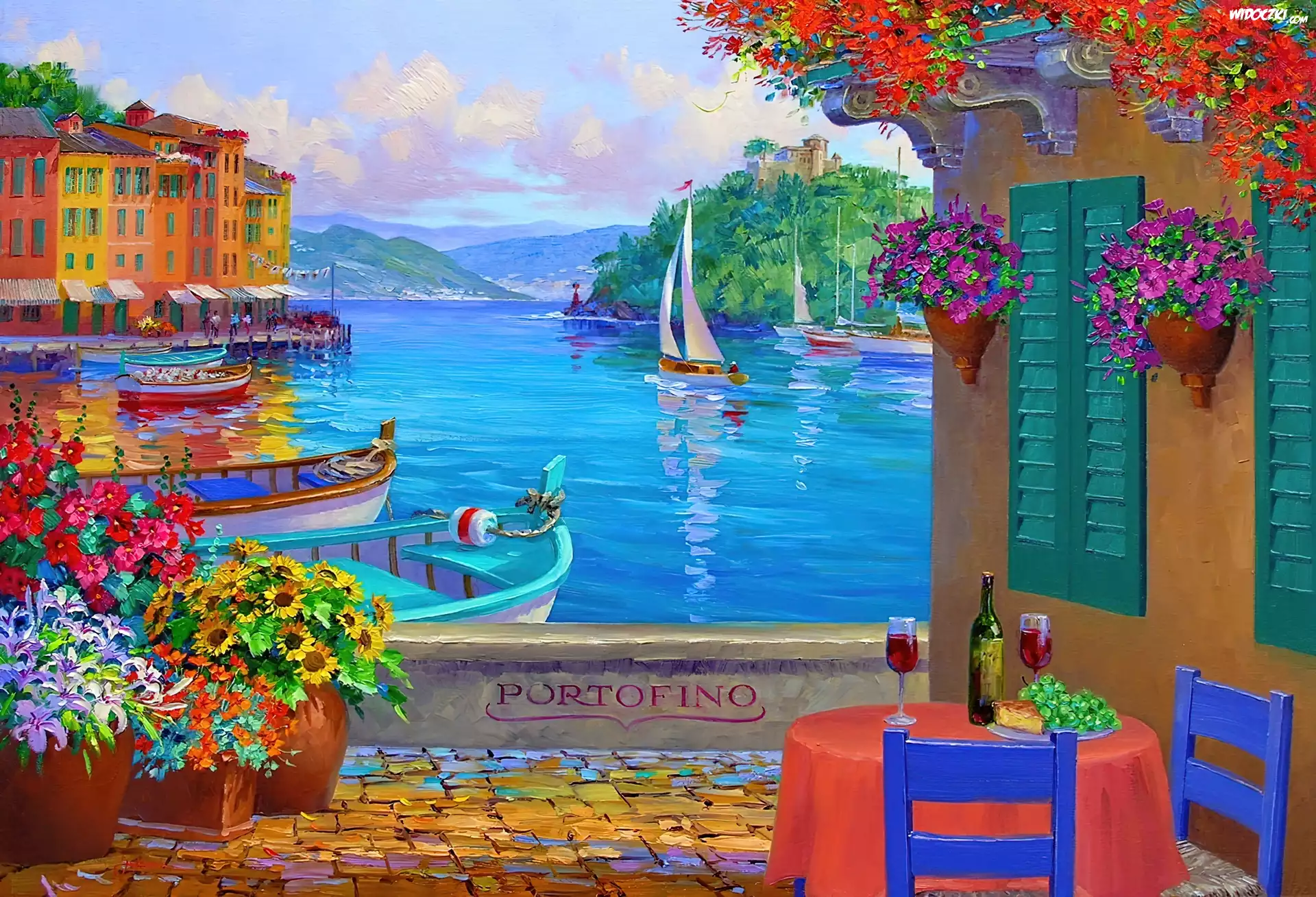 Zdjęcia, Taras, Stolik Kwiaty, Widok, Na, Zatokę, Domy, Morze