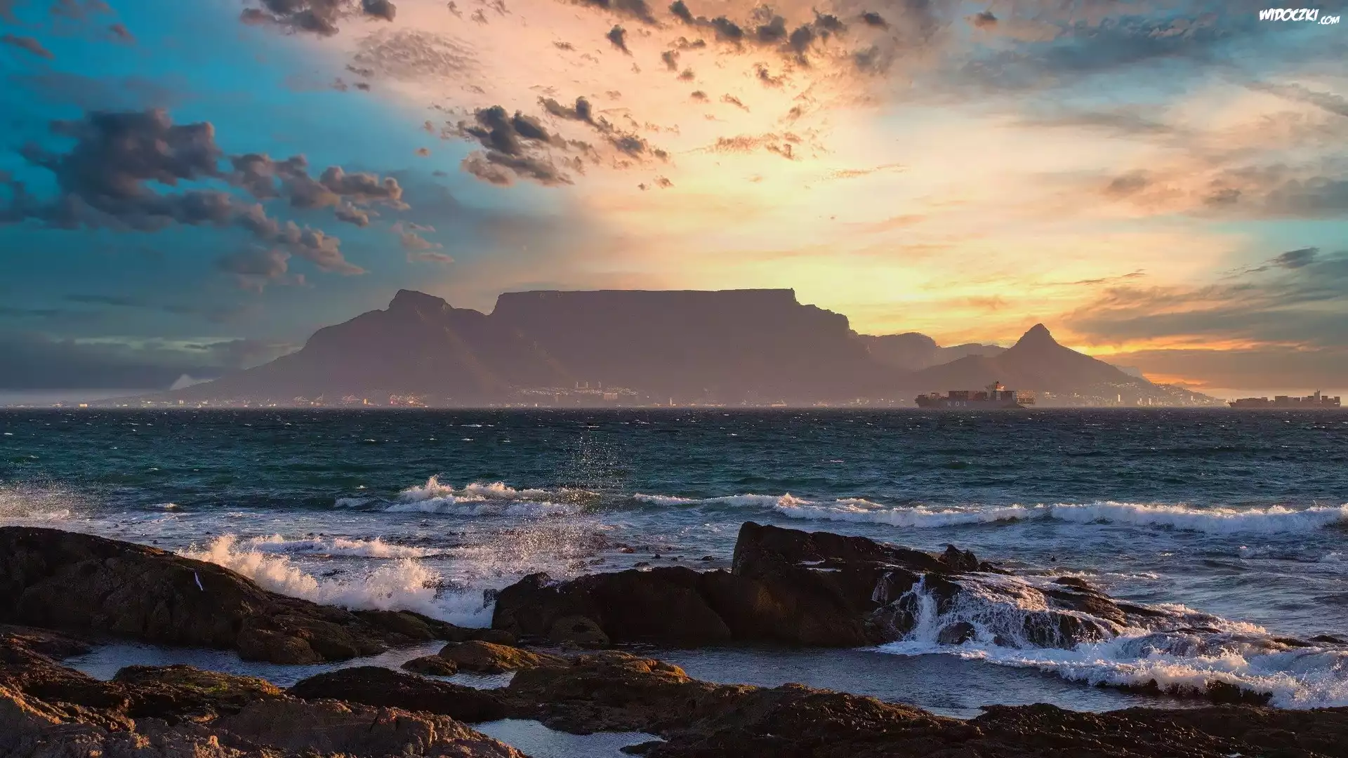 Morze, Zatoka Stołowa, Góry, Góra Stołowa, Skały, Zachód słońca, Kapsztad, Afryka