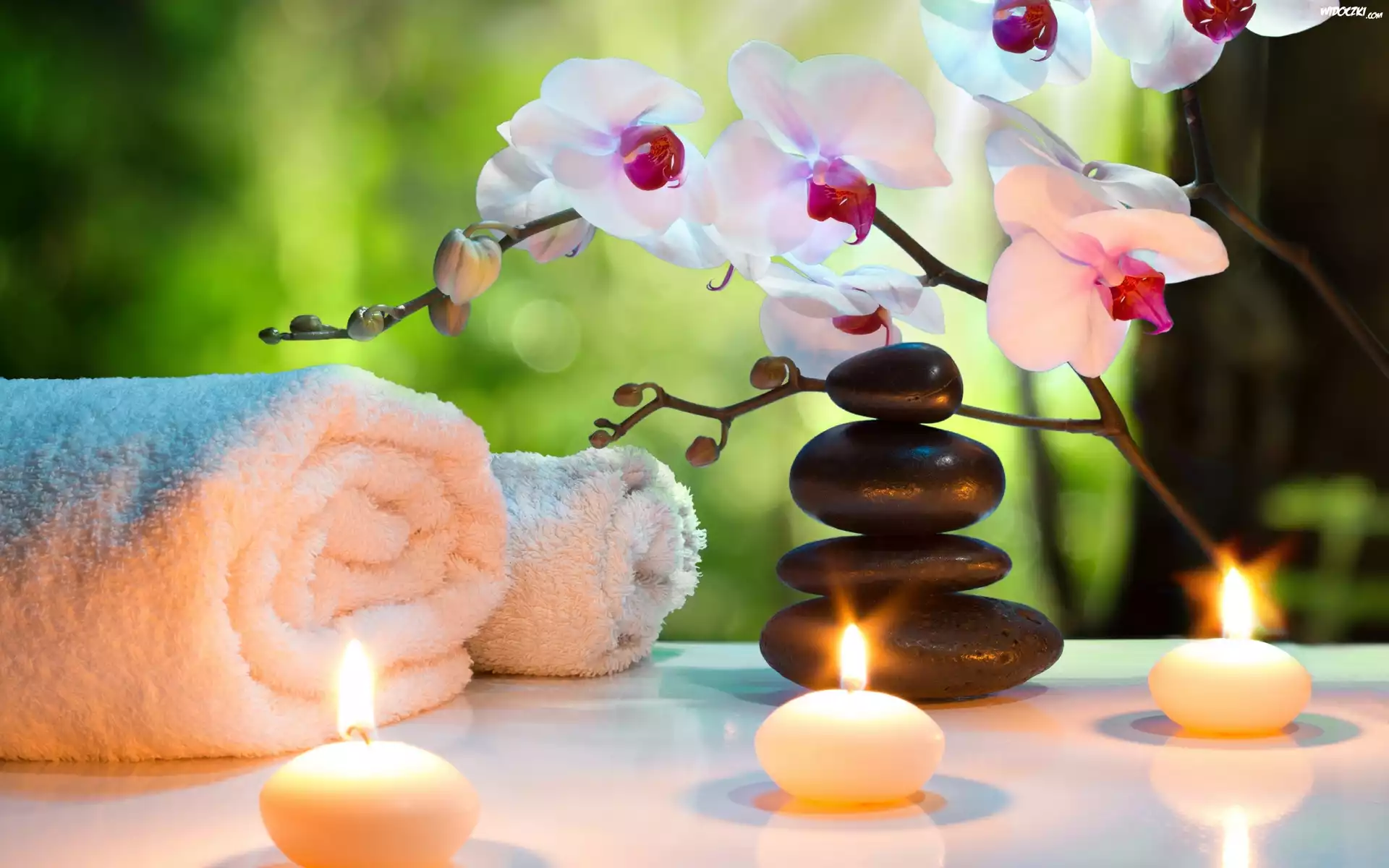Storczyki, Świece, Kamienie, Ręczniki, SPA, Kompozycja