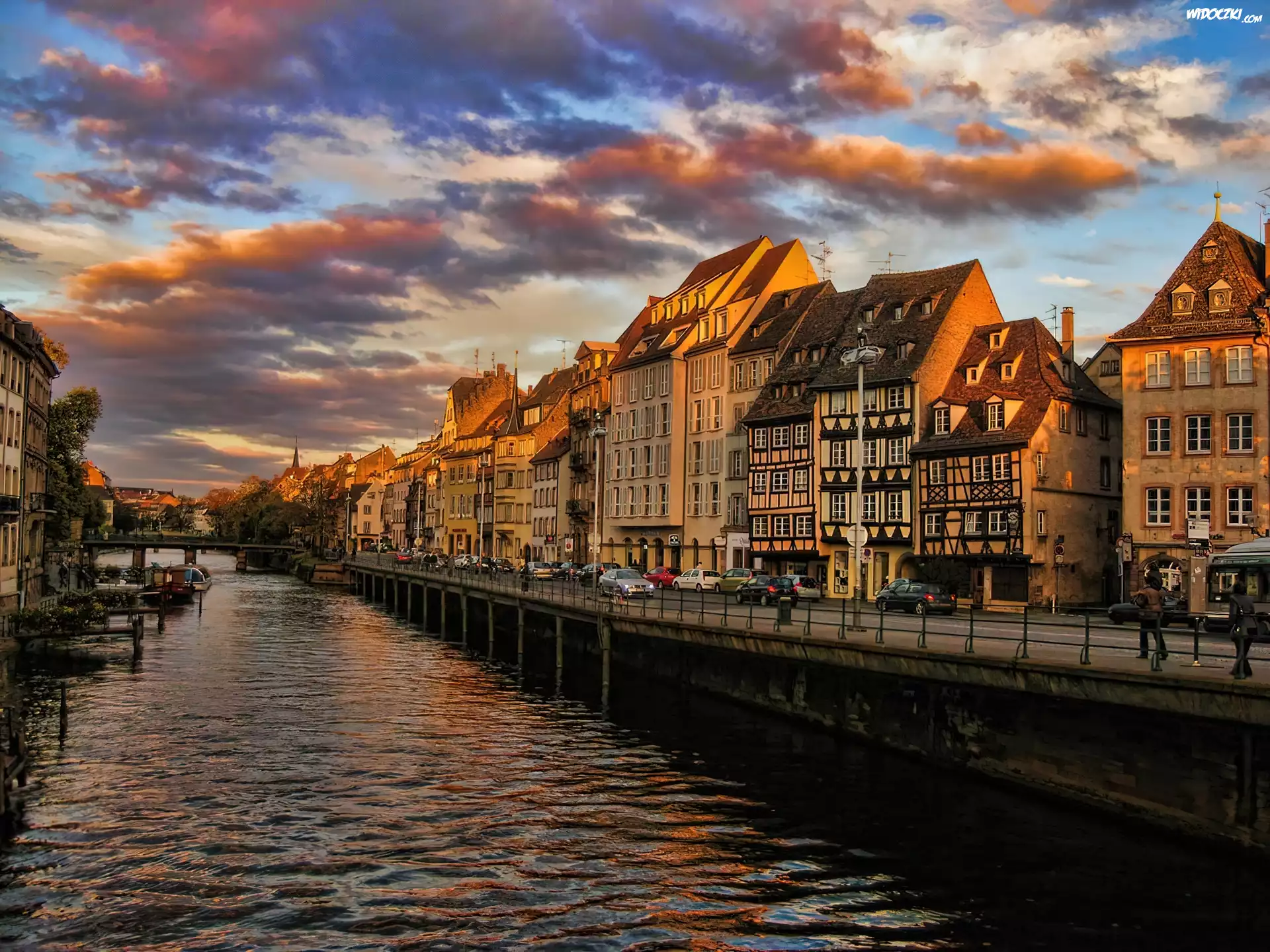 Zdjęcia, Strasburg, Rzeka, Ill, Kamienice, Zachód, Słońca