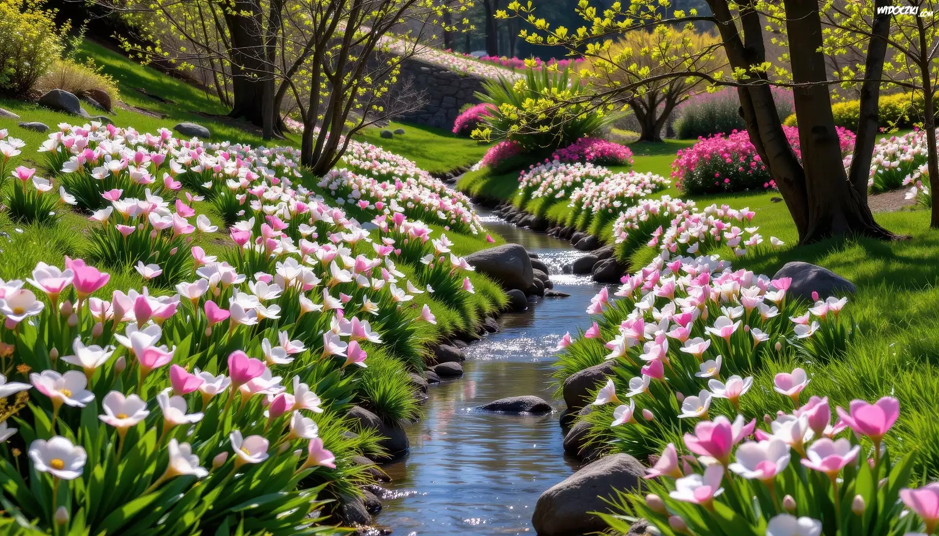Kwiaty, Strumień, Drzewa, Wiosna, Grafika