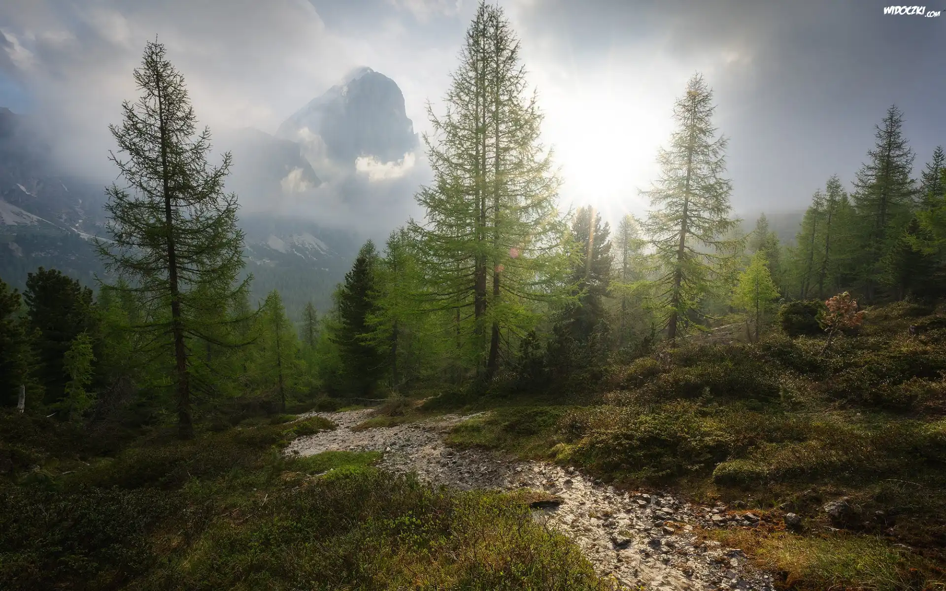 Las, Drzewa, Kamienie, Strumyk, Góry, Mgła, Poranek