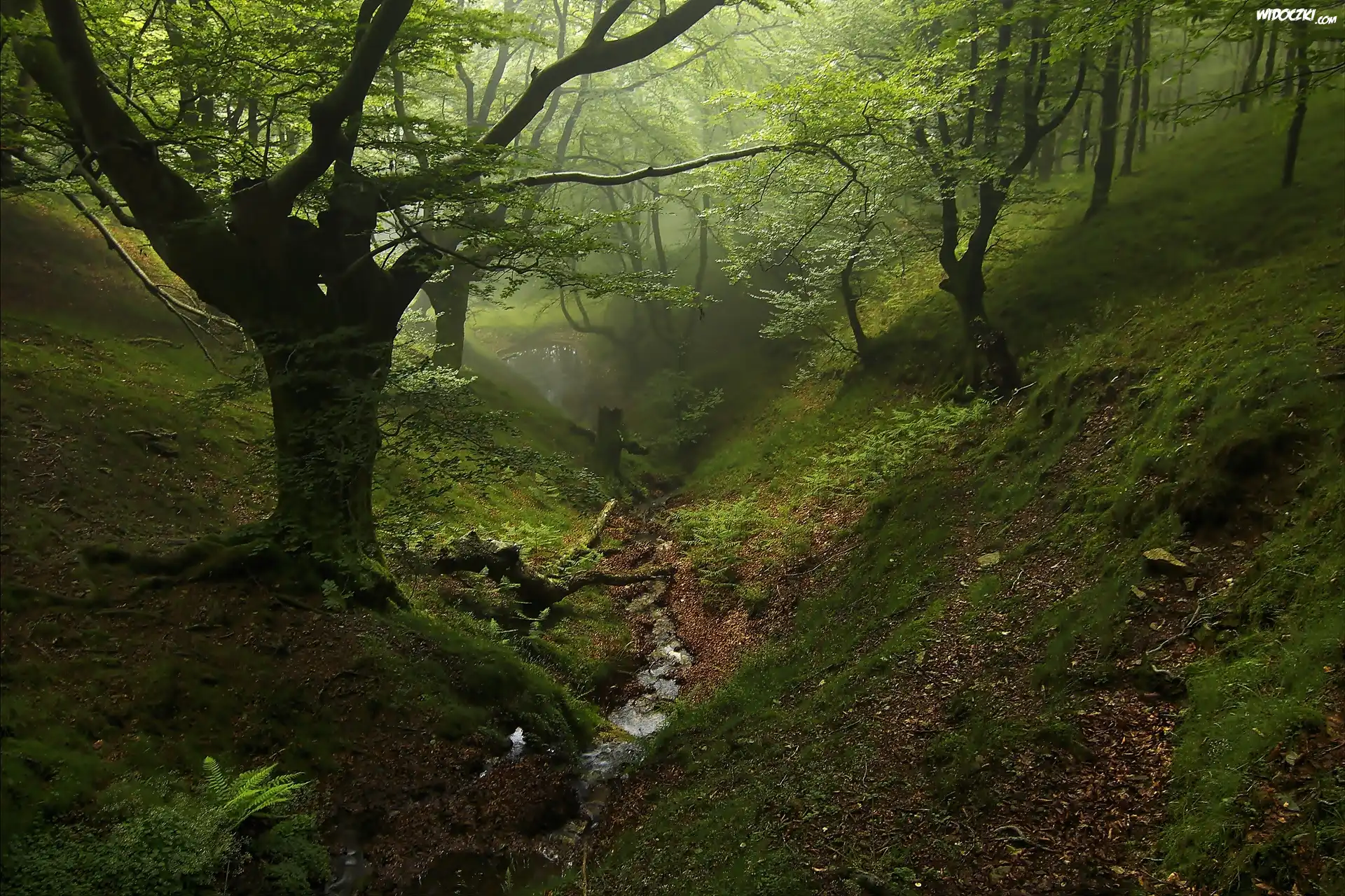Zdjęcia, Strumyk, Drzewa, Mgła, Las