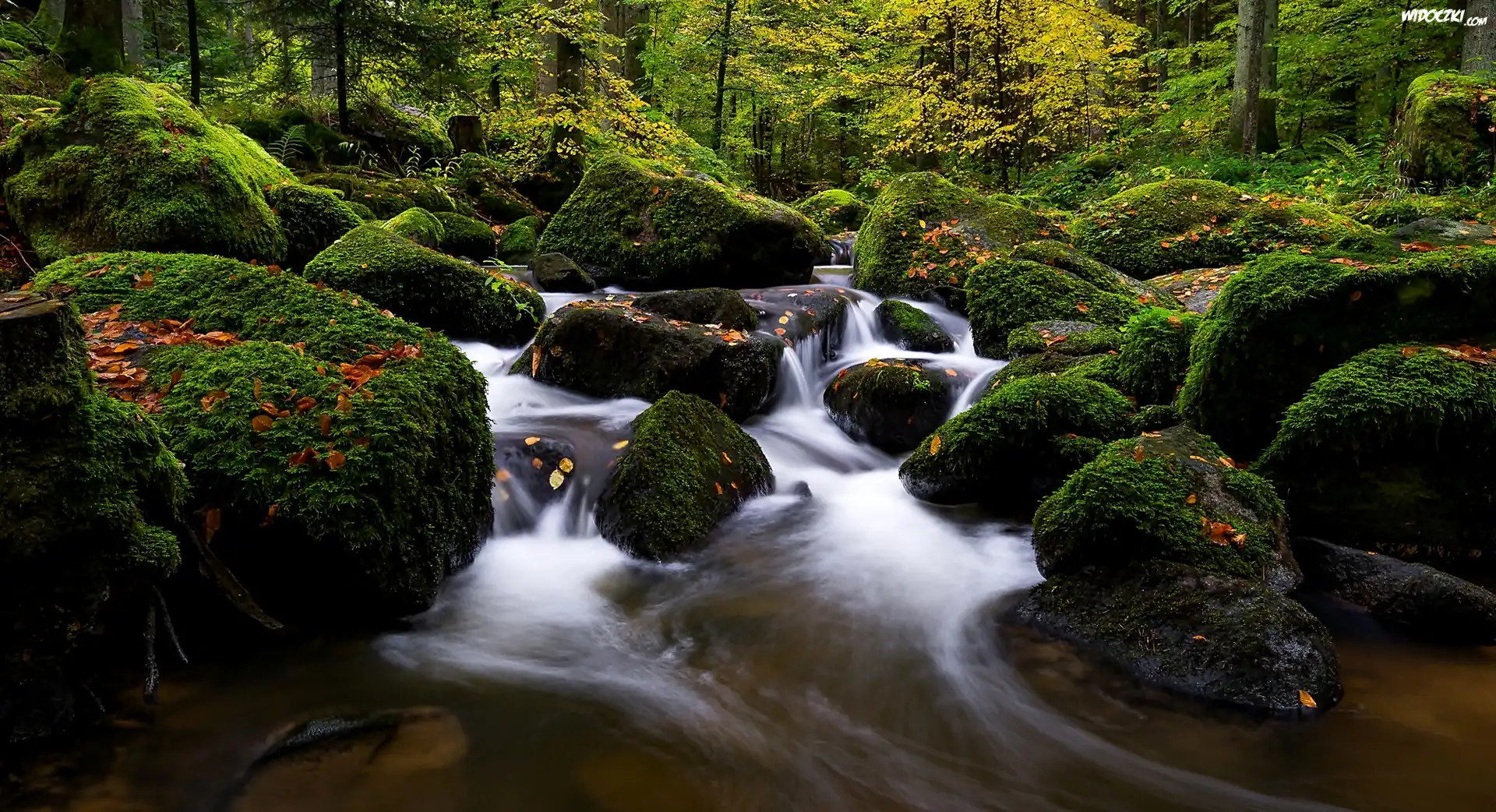 Zdjęcia, Rzeka, Strumyk, Omszałe, Kamienie, Liście, Drzewa, Las