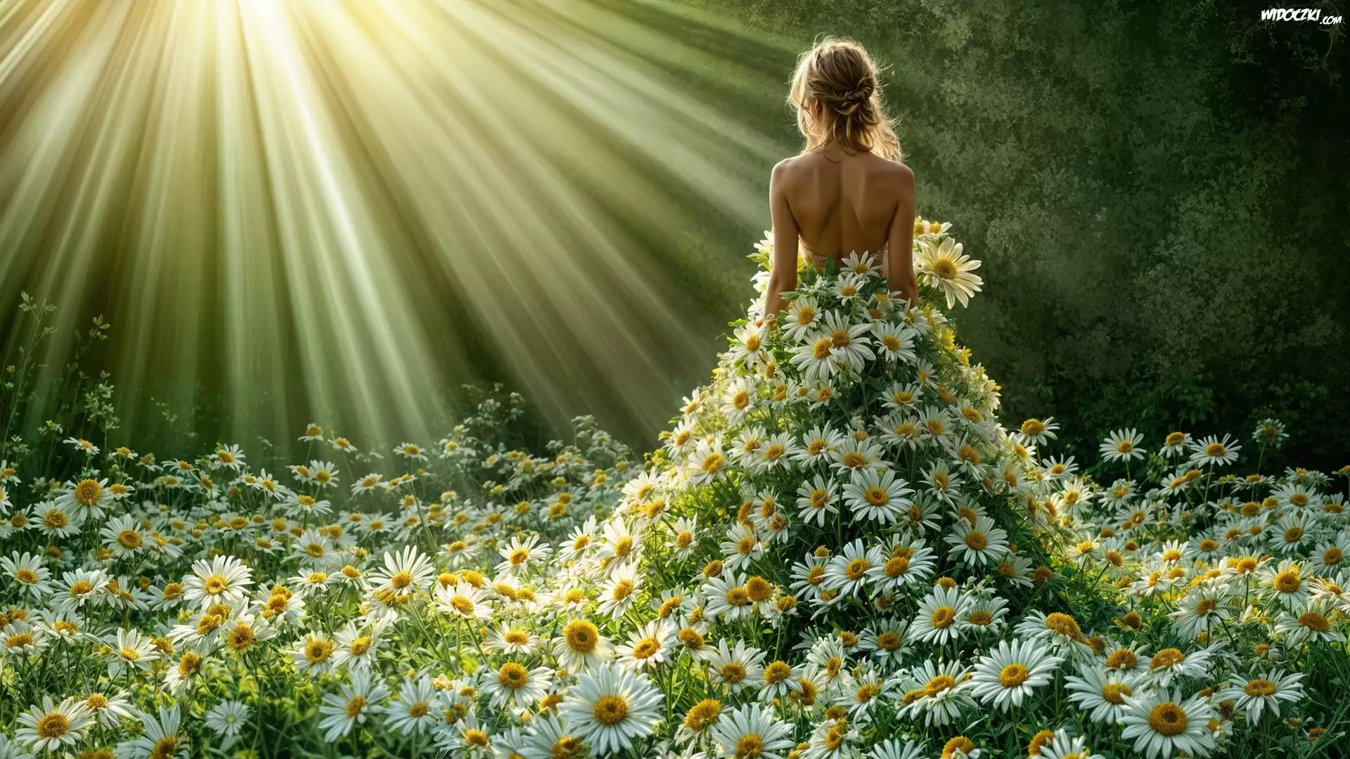 Kobieta, Suknia, Kwiaty, Promienie słońca