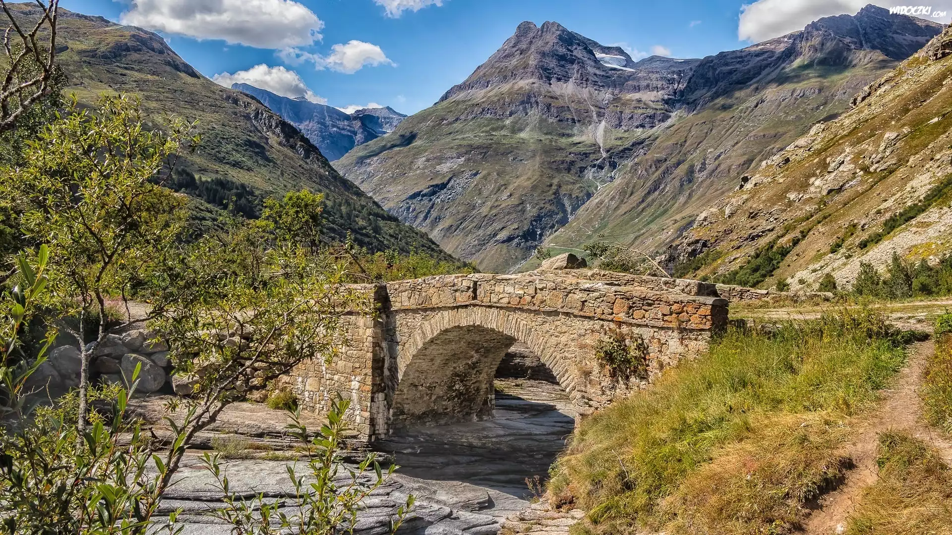 Zdjęcia, Góry, Alpy, Kamienny, Most, Rzeka, Kamienie, Trawa, Drzewa, Bonneval sur Arc, Francja
