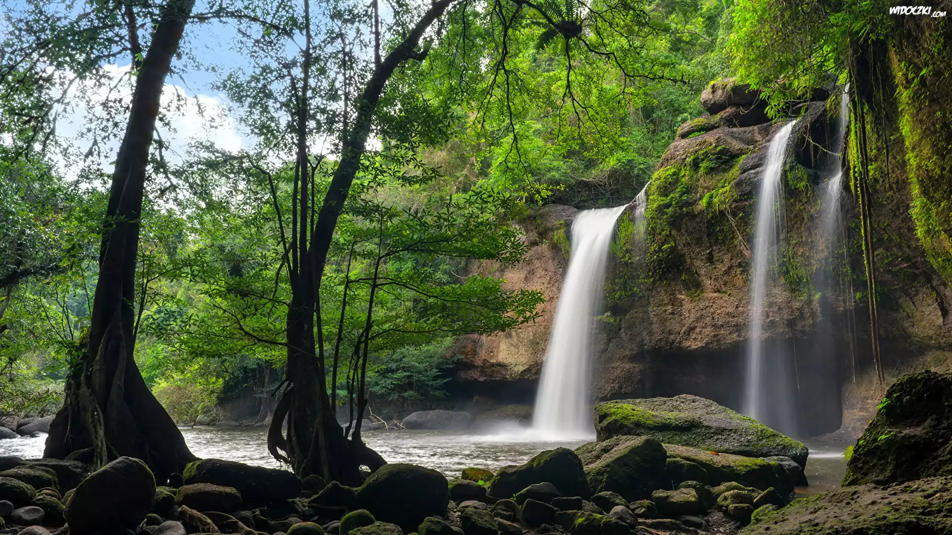 Zdjęcia, Wodospad Haew Suwat, Park Narodowy Khau Yai, Omszałe, Kamienie, Drzewa, Tajlandia