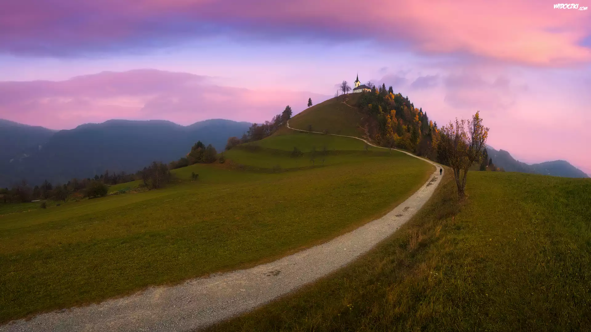Zdjęcia, Wzgórze, Drzewa, Droga, Kościół, Cerkiew św. Jakuba, Zachód słońca, Wieś Zlebe, Słowenia