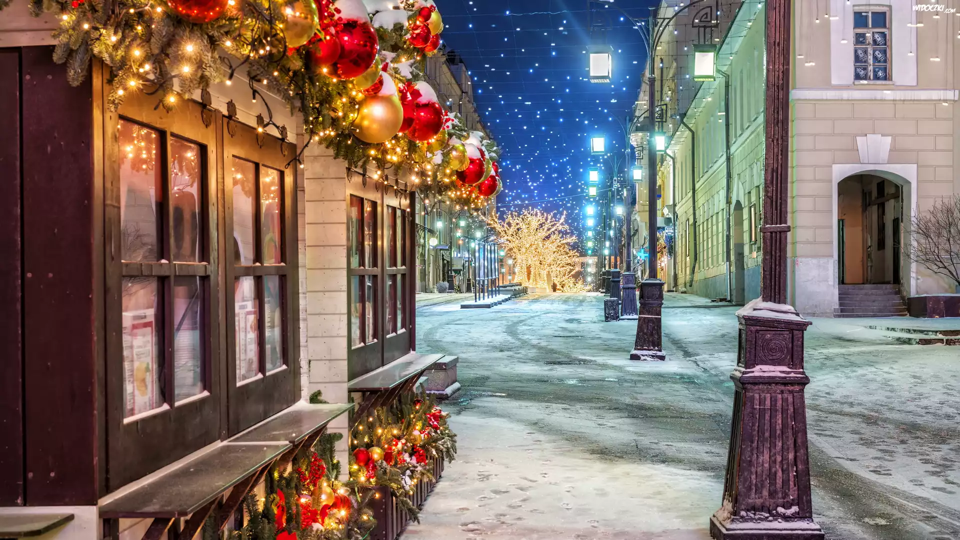 Zima, Śnieg, Ulica, Domy, Latarnie, Ozdoby, Świąteczne, Girlandy, Bombki, Boże Narodzenie