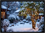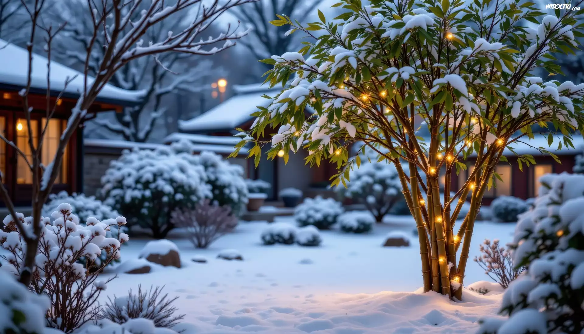 Zdjęcia, Zima, Ogród, Drzewko, Światełka, Dom, Grafika AI
