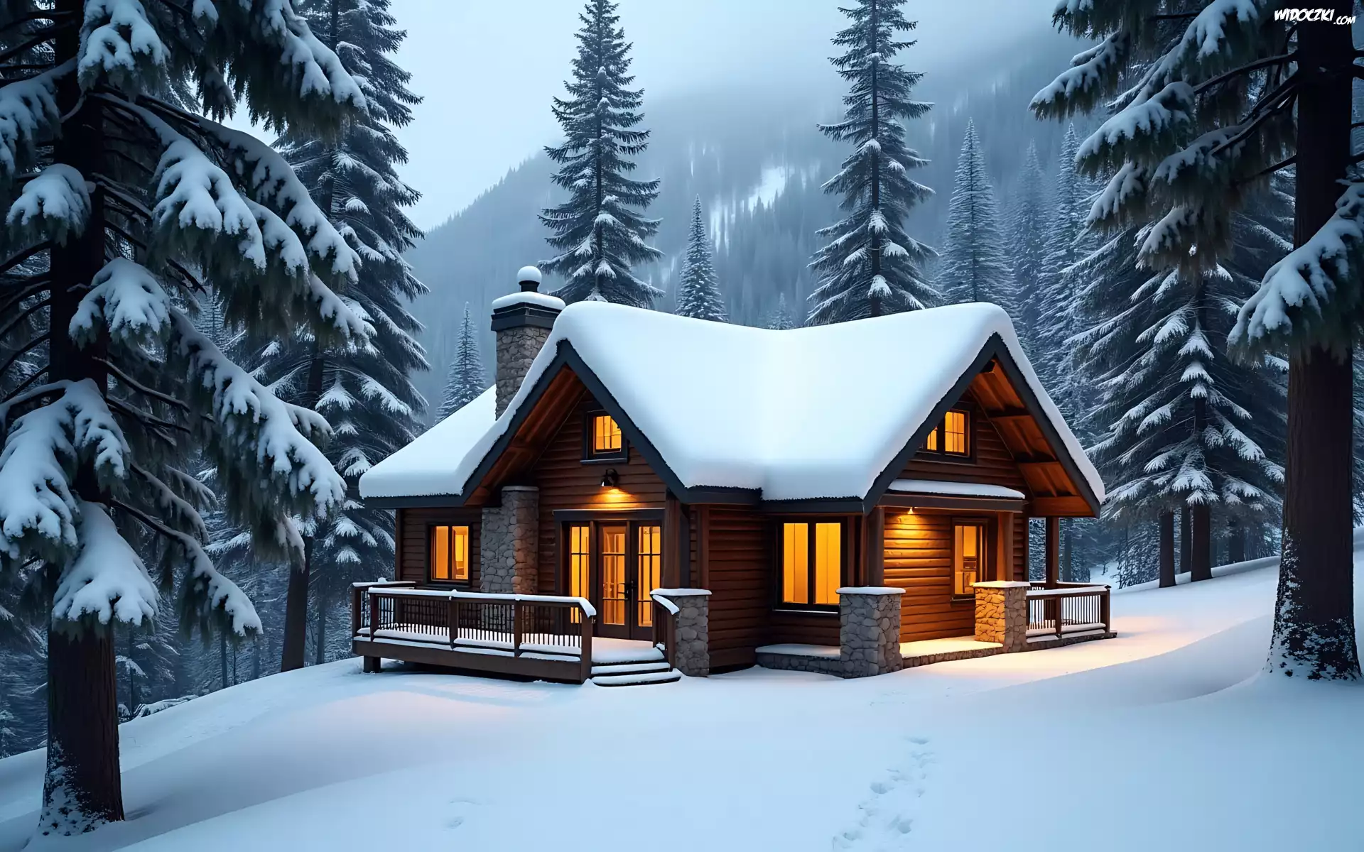 Zdjęcia, Zima, Las, Dom, Światła, Śnieg, Drzewa