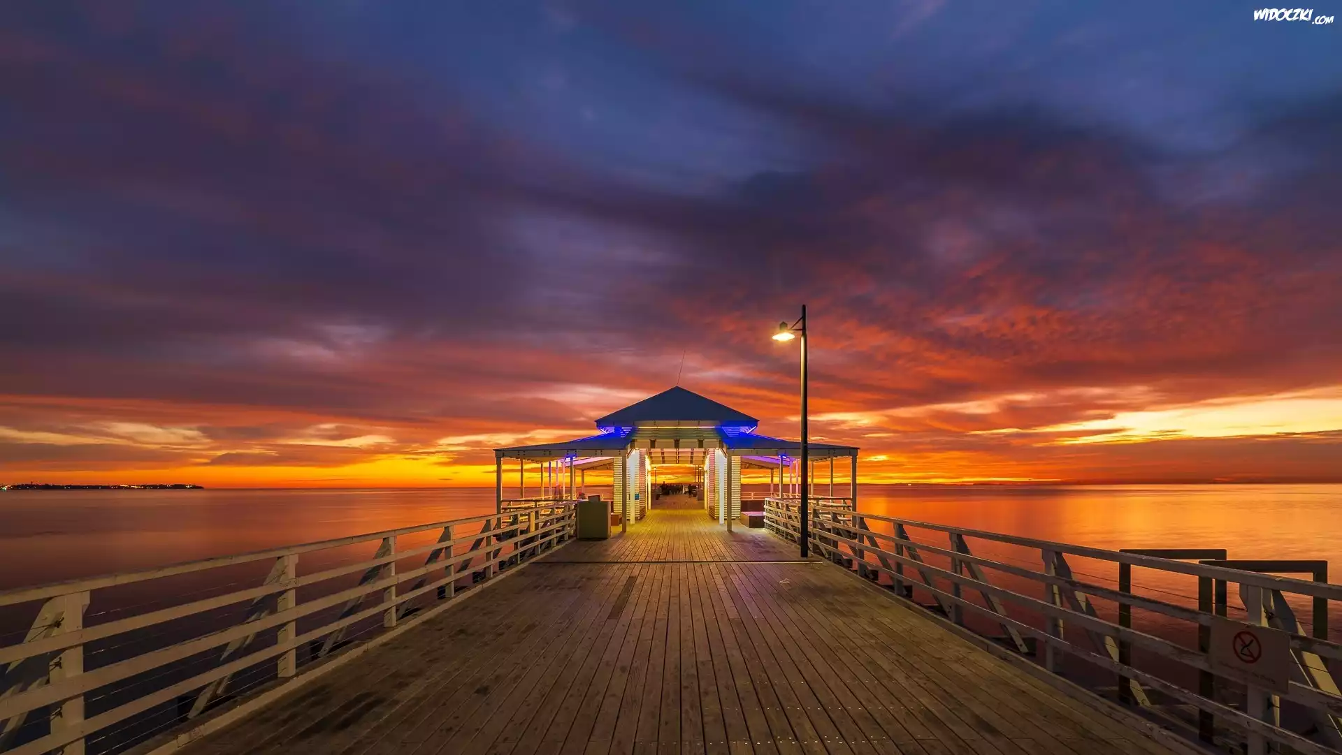 Morze, Molo, Latarnia, Światła, Zachód słońca