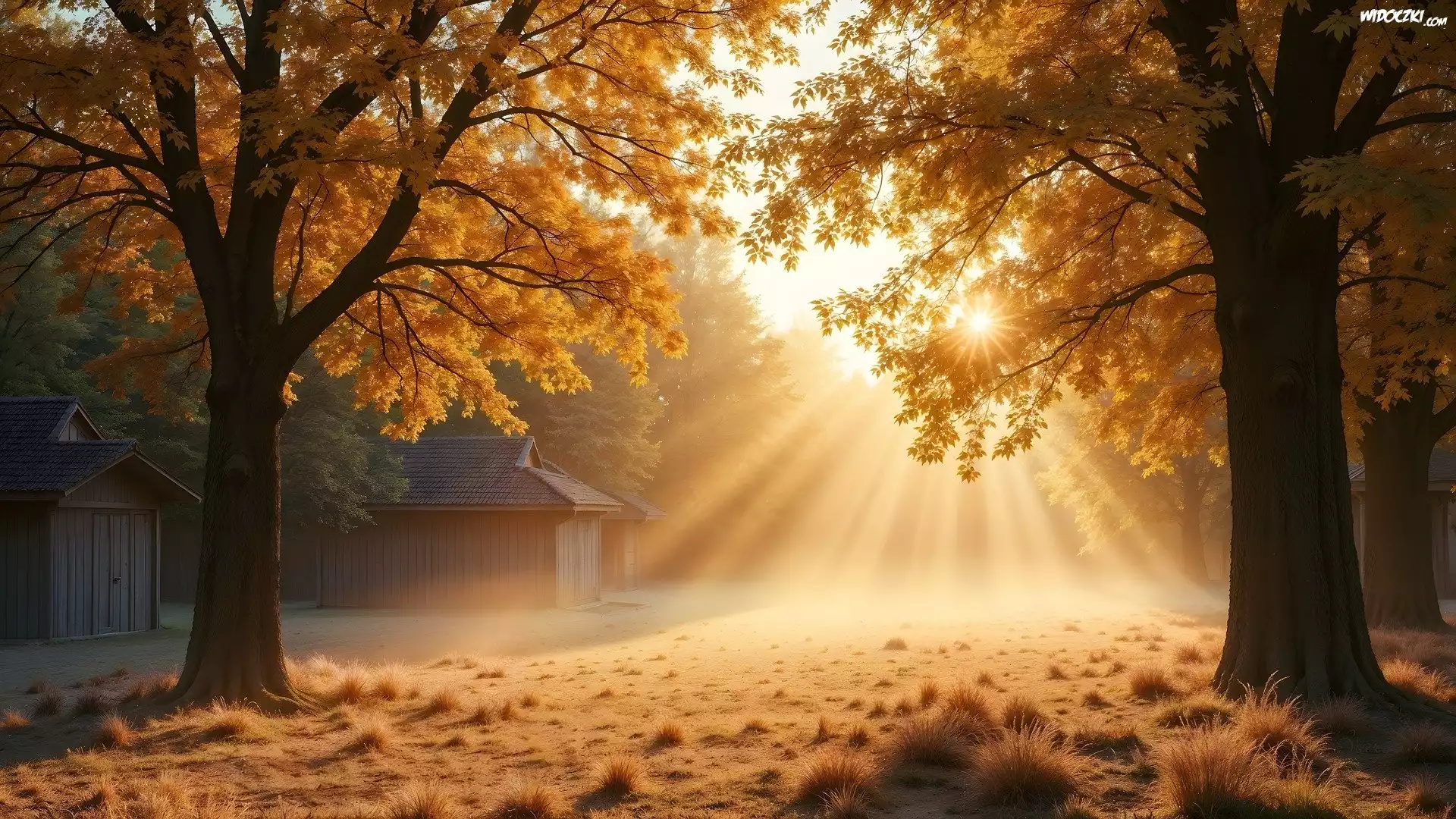 Jesień, Drzewa, Przebijające światło, Grafika AI