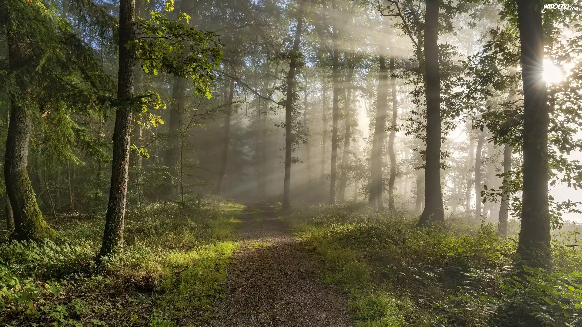 Zdjęcia, Las, Droga, Przebijające światło, Słońce, Drzewa