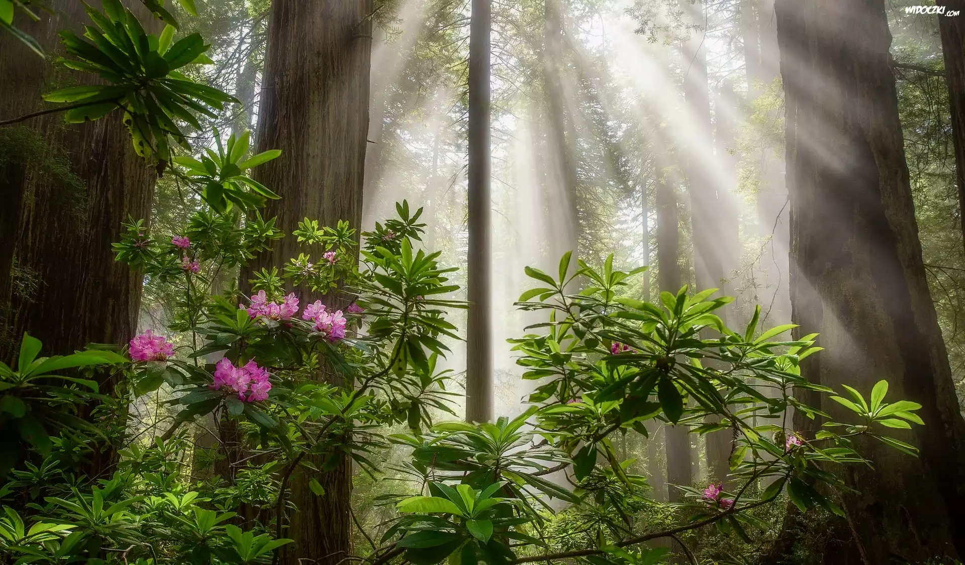Stany Zjednoczone, Kalifornia, Park Narodowy Redwood, Drzewa, Sekwoje, Przebijające światło, Różanecznik, Kwiaty |