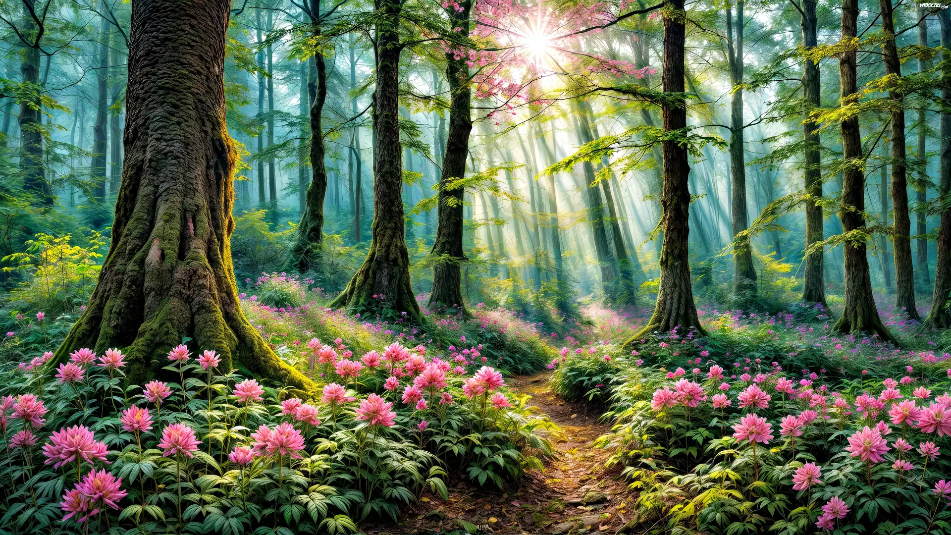 Las, Różowe, Kwiaty, Ścieżka, Słońce, Grafika, Przebijające światło