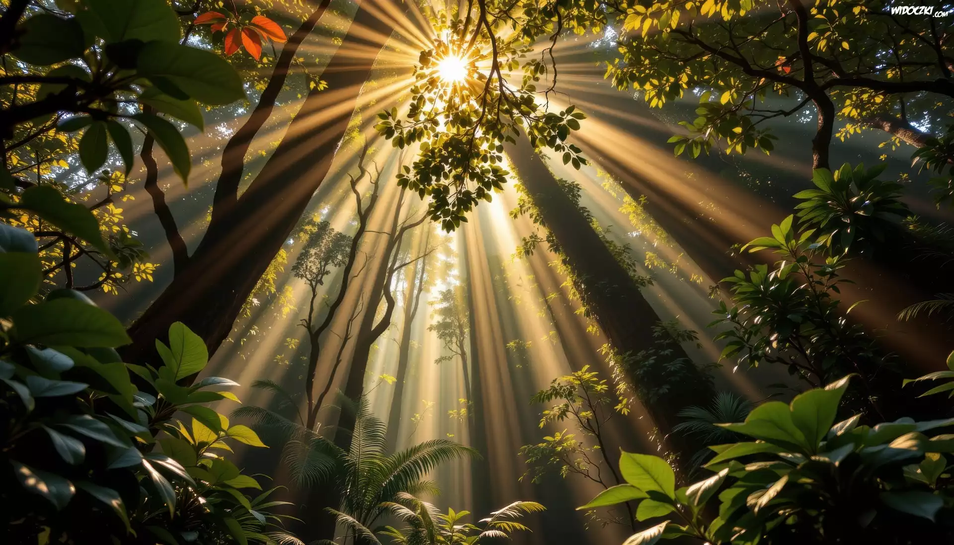 Las, Drzewa, Przebijające światło, Liście, Grafika AI