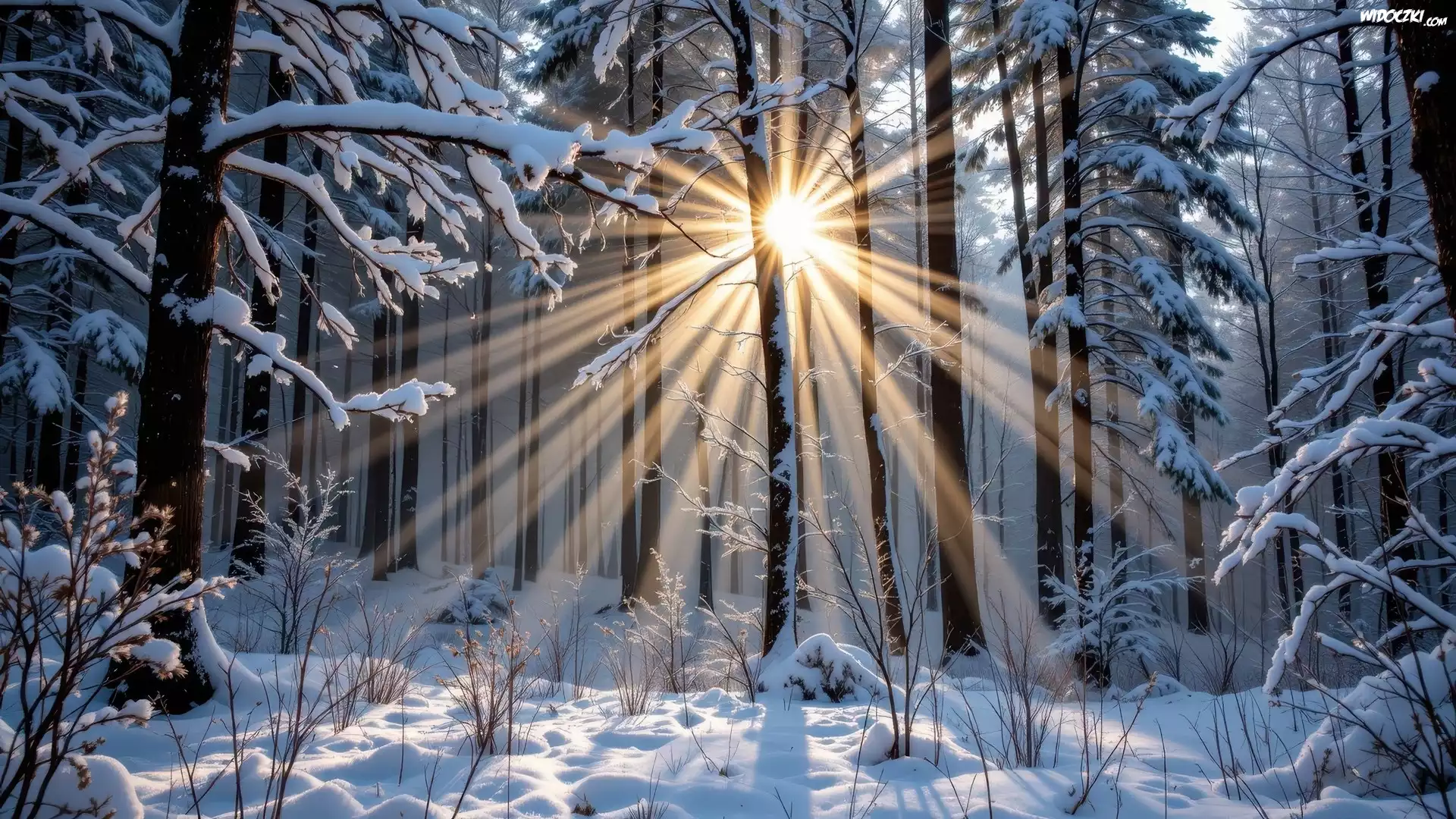 Zdjęcia, Zima, Las, Przebijające światło, Śnieg, Rośliny, Drzewa