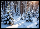Zdjęcia, Las, Świerki, Przebijające światło, Zima, Grafika AI