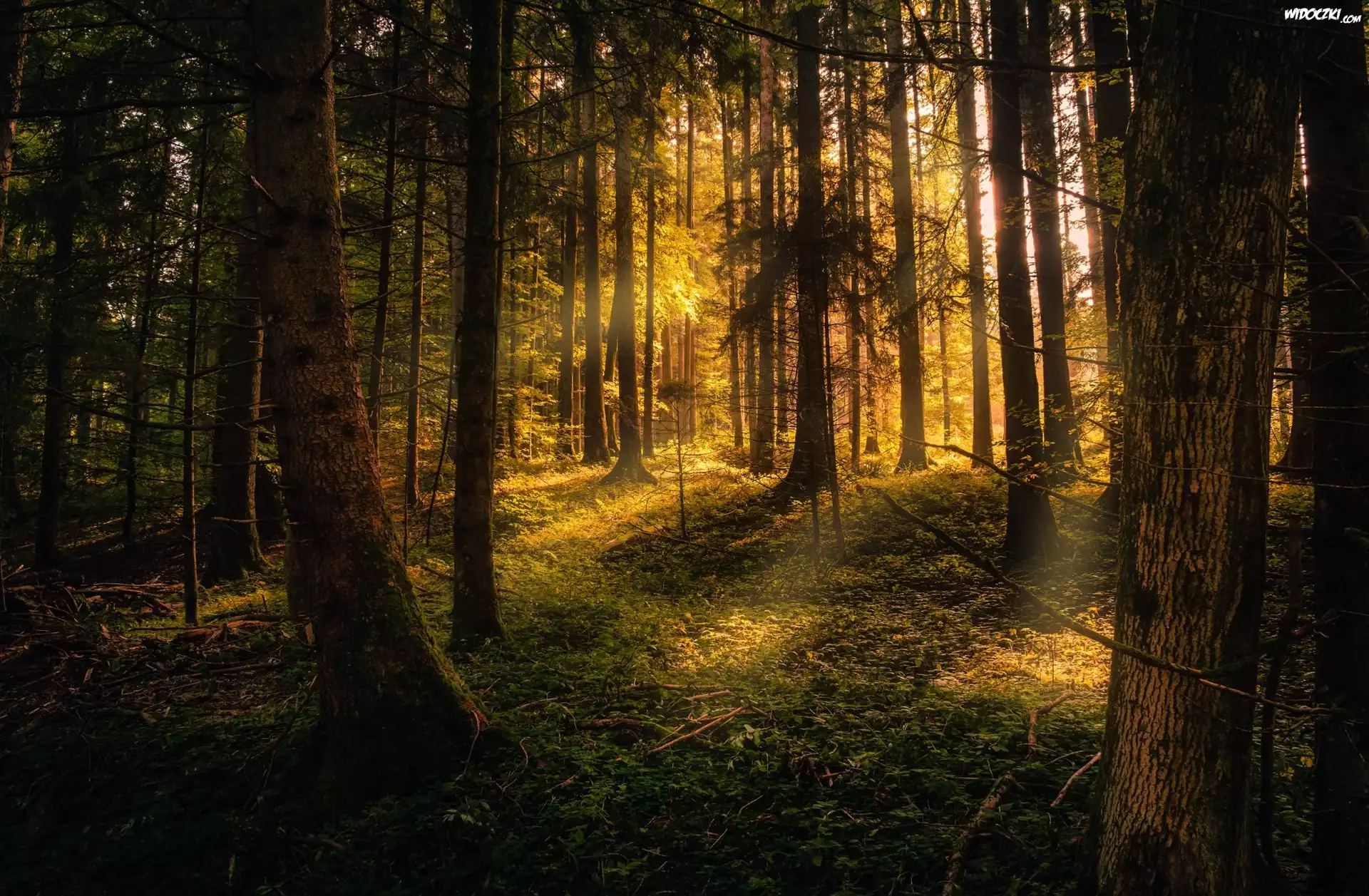 Zdjęcia, Niemcy, Badenia-Wirtembergia, Góra Gehrenberg, Las, Drzewa, Przebijające światło