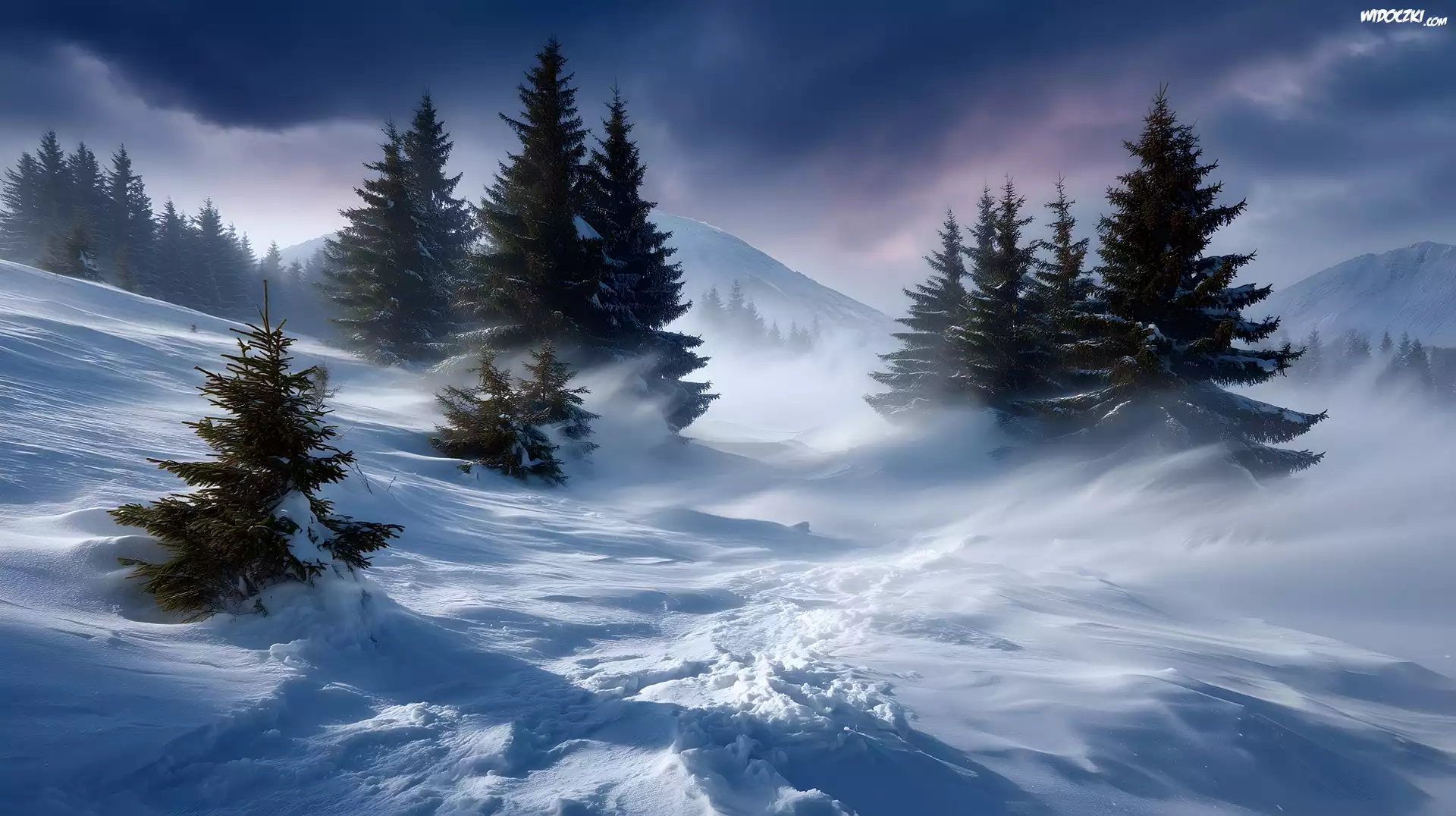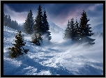 Zima, Zbocze, Drzewa, Świerki, Zamieć, Grafika AI
