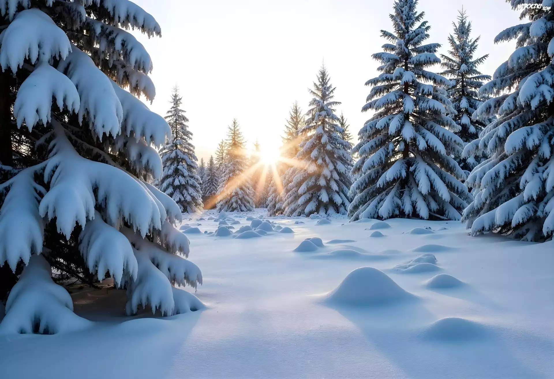 Zdjęcia, Zima, Świerki, Promienie słońca, Śnieg