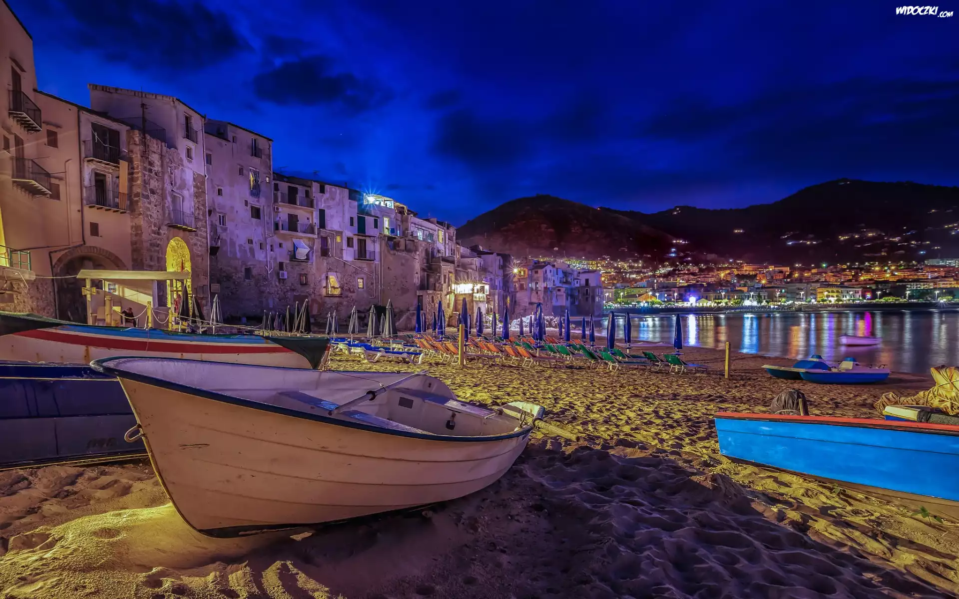 Zdjęcia, Włochy, Sycylia, Cefalù, Wybrzeże, Plaża, Łódki