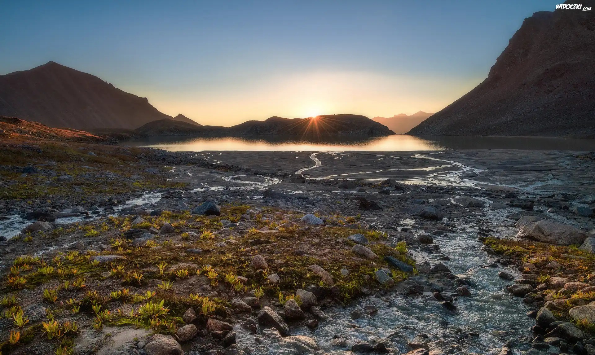 Góry, Jezioro Syltrankel, Promienie słońca, Kamienie, Region Elbrus, Kabardo-Bałkaria, Rosja