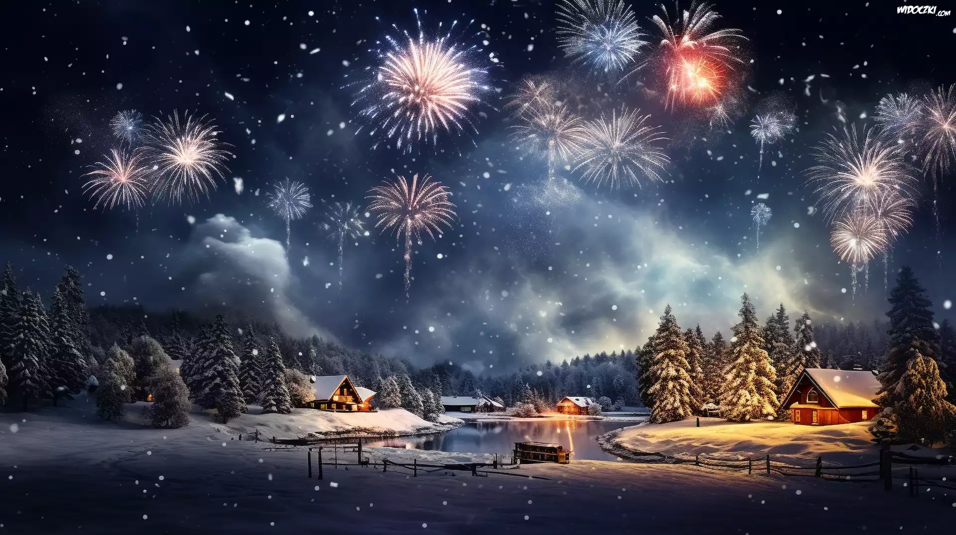Zdjęcia, Zima, Domy, Rzeka, Sylwester, Fajerwerki, Drzewa, Grafika