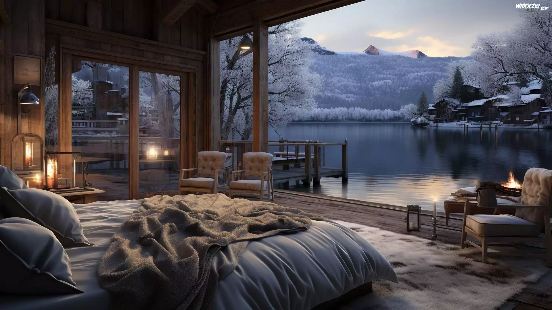 Zdjęcia, Wnętrze, Sypialnia, Jezioro, Zima, Grafika