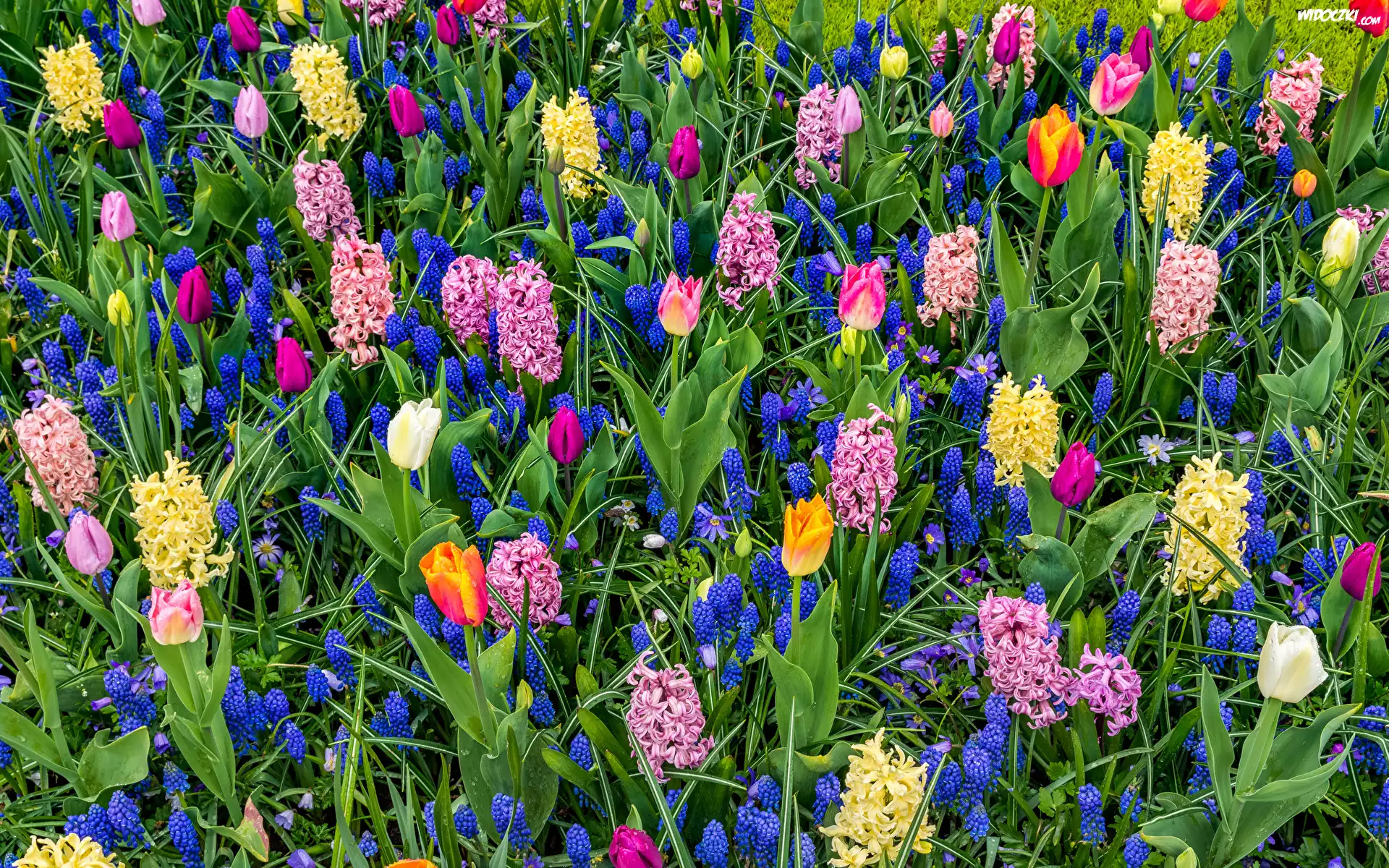 Zdjęcia, Łąka, Kwiaty, Tulipany, Szafirki, Hiacynty