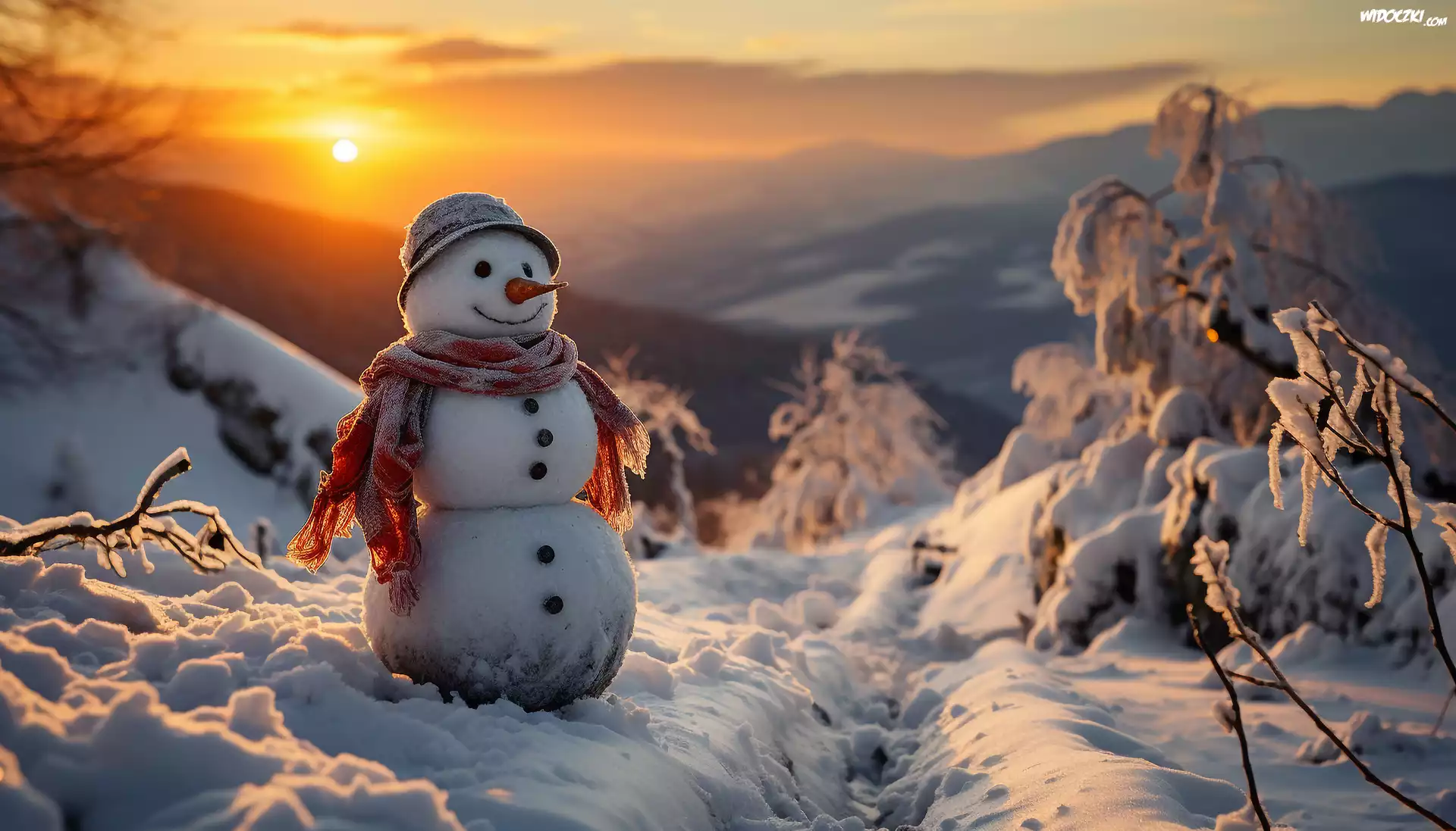 Zdjęcia, Zima, Bałwan, Kapelusz, Szal, Zachód słońca